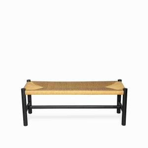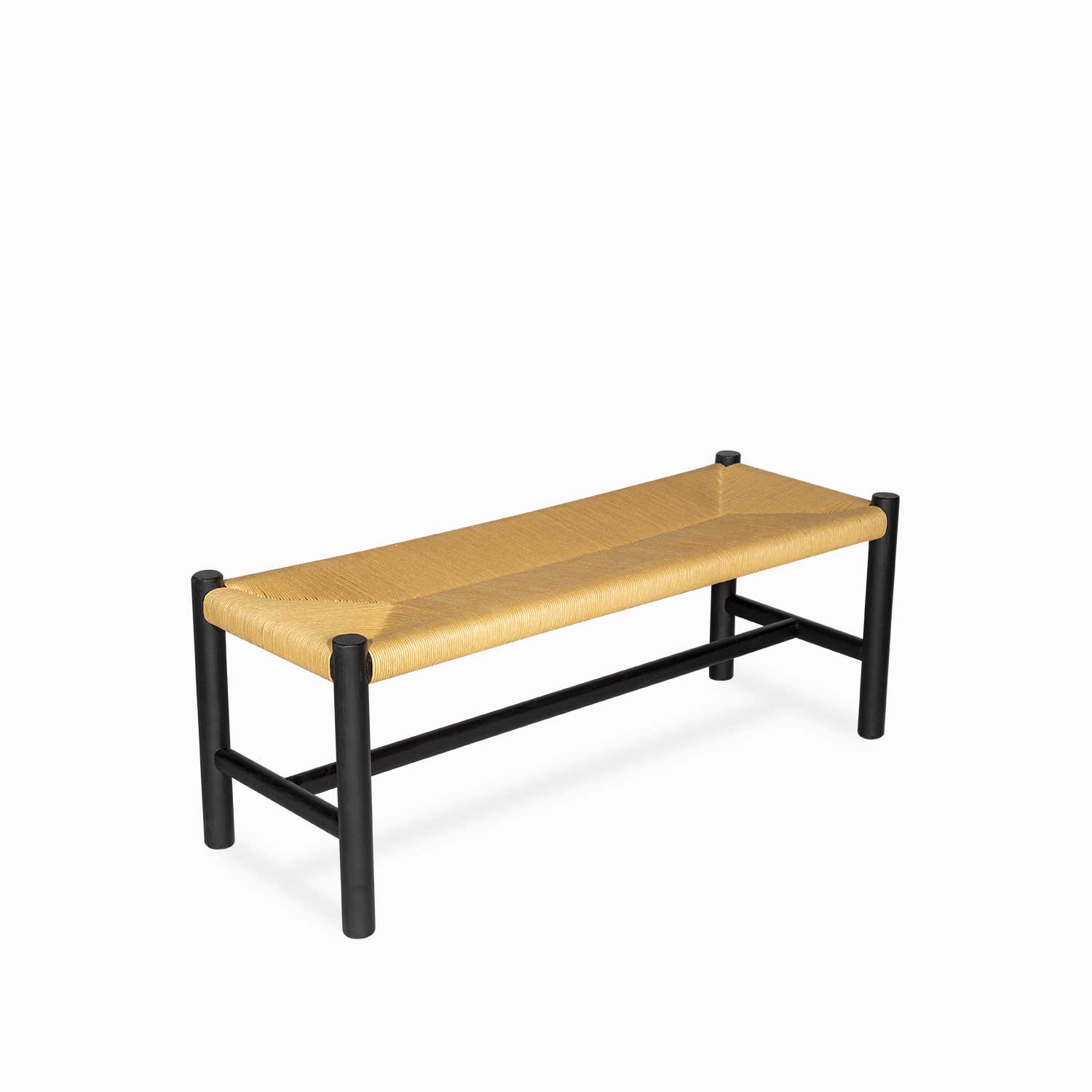 Silla tipo banca en madera y tejido para alcoba o sala con estructura en color negro, las variaciones y las imperfecciones hacen parte de su diseño y lo convierten en una pieza única.
