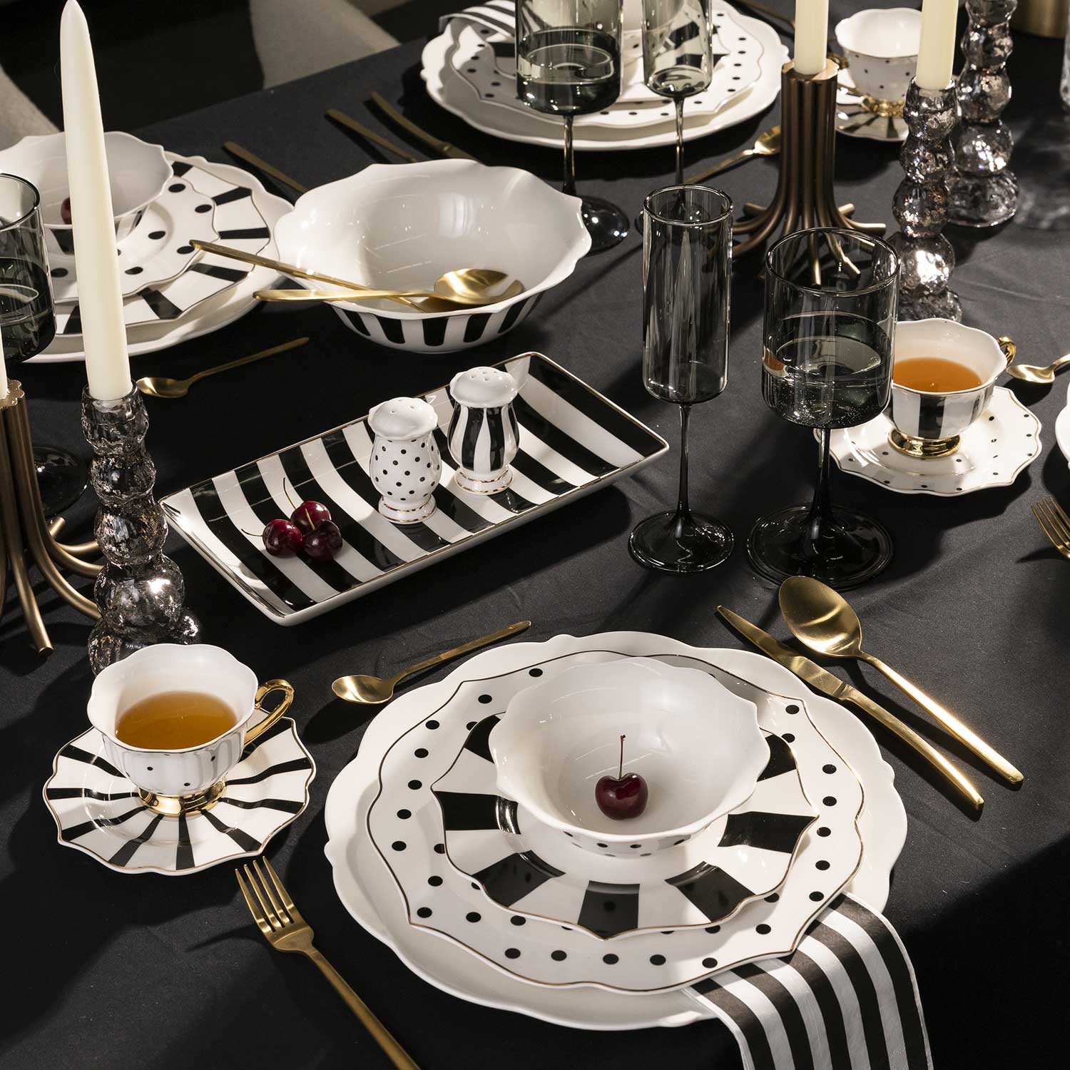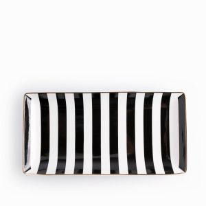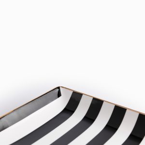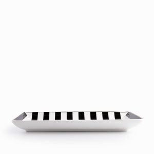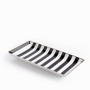 Es el accesorio de servicio clave para presentar alimentos, o bien, para utilizarse como base decorativa para velas o joyería, demostrando su valía en la funcionalidad atemporal. Es perfecta para exhibir aperitivos, sushi o postres en secuencia, creando una puesta en escena de alta cocina. El diseño Blanco y Negro en porcelana aporta un toque llamativo y único.