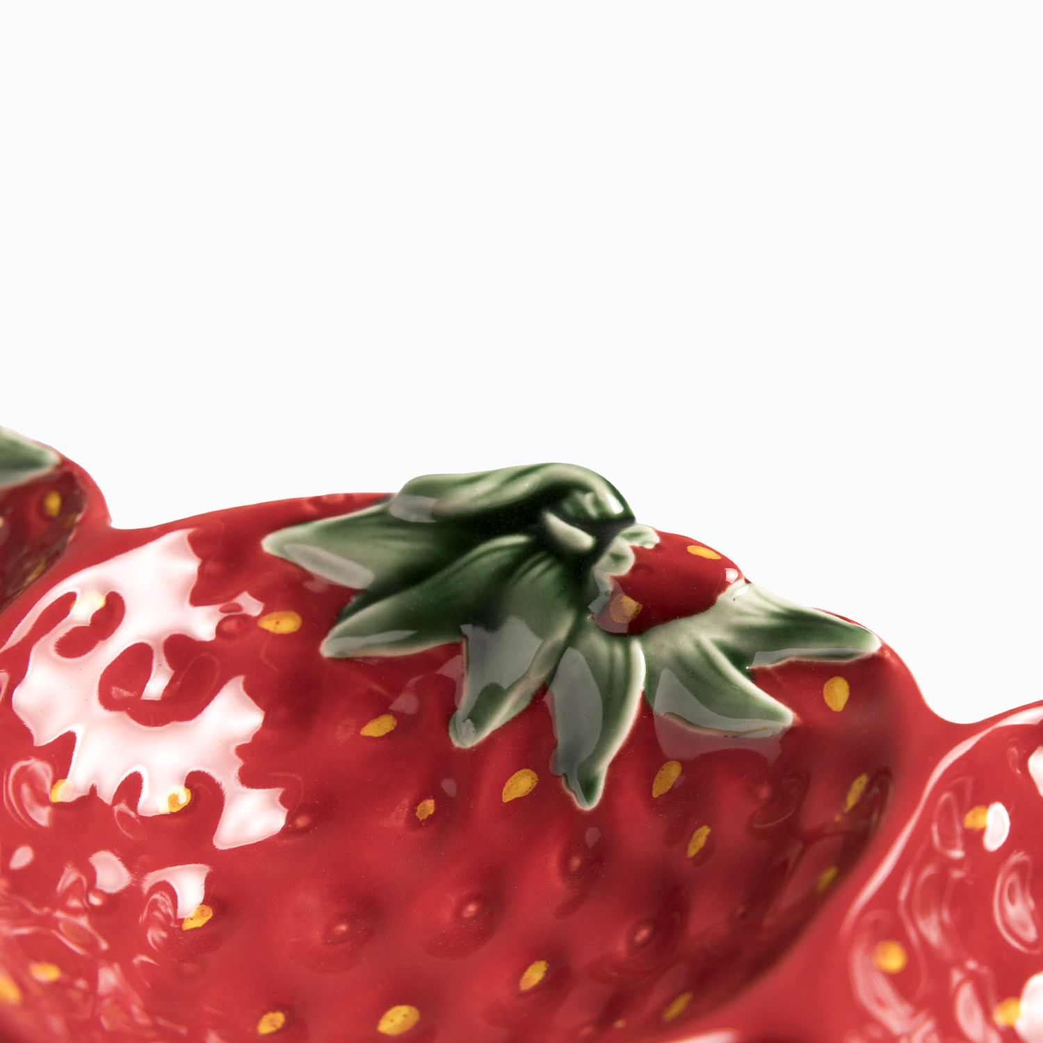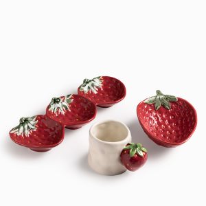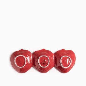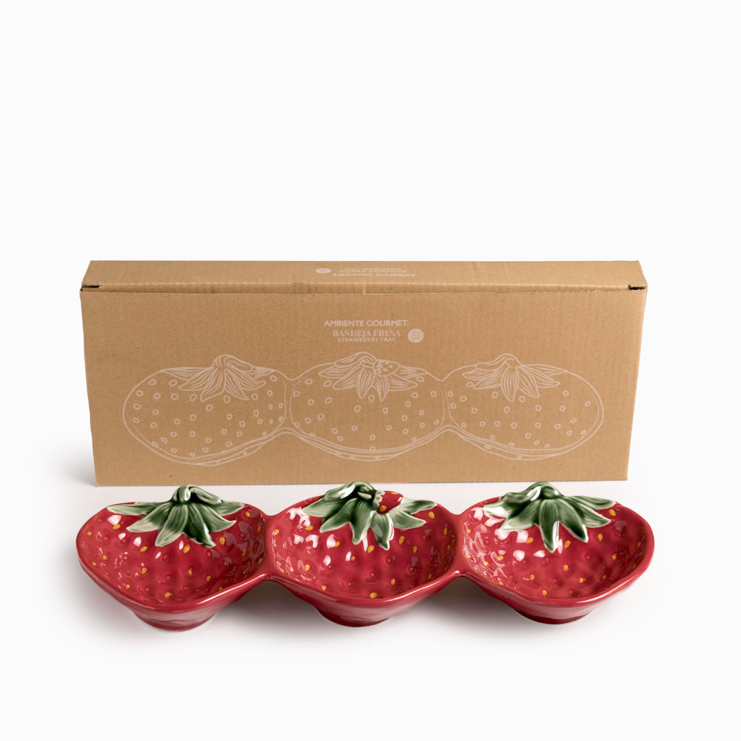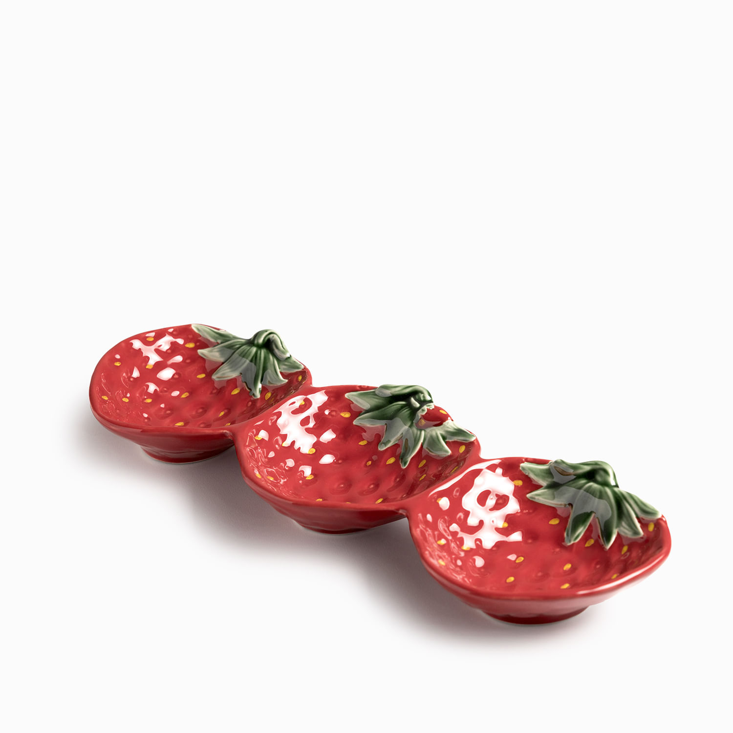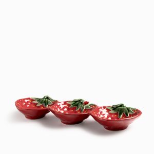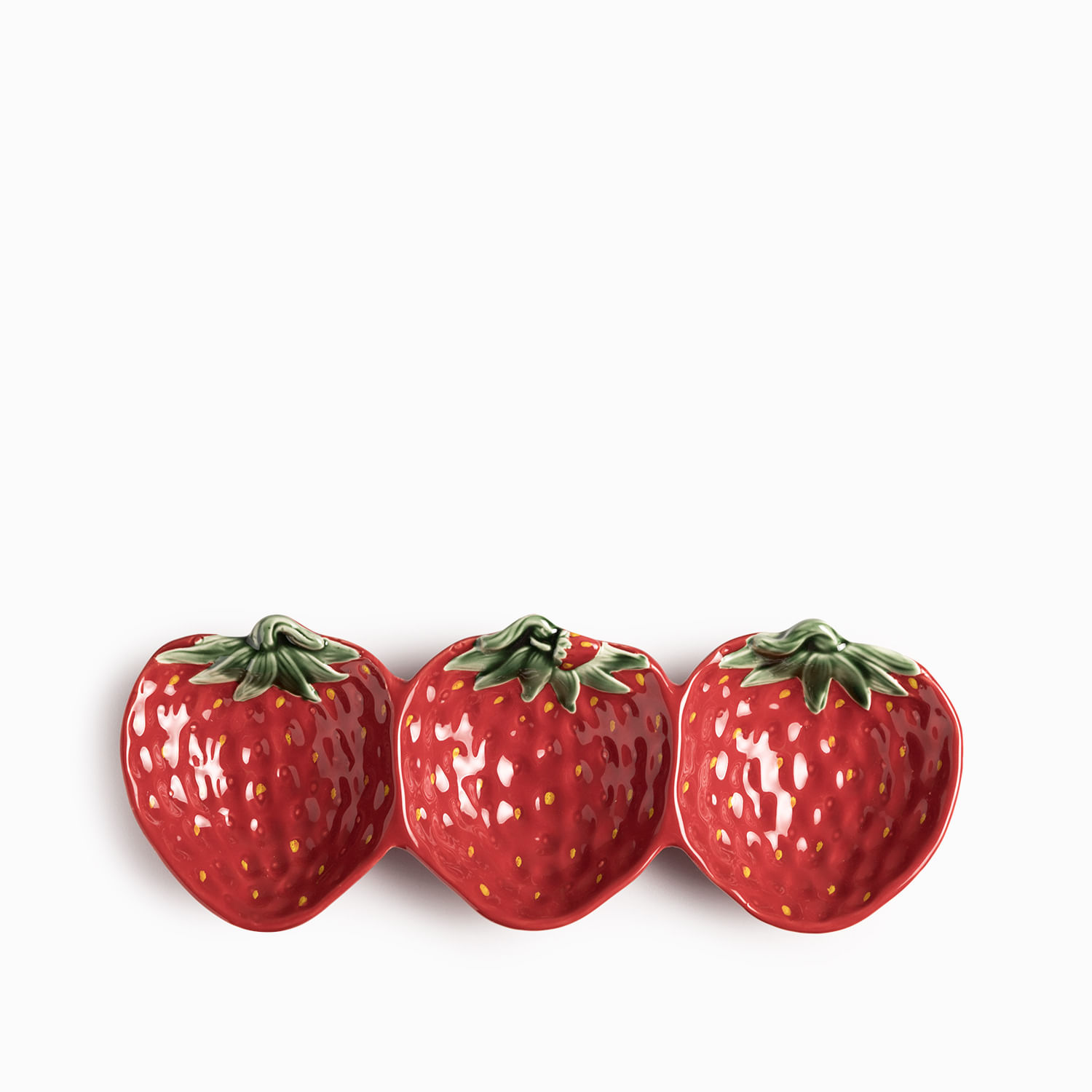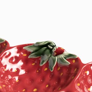 Esta bandeja en cerámica presenta una silueta original formada por tres fresas unidas, con un largo de 33 cm, es la pieza perfecta para servir aperitivos, dulces, frutas o pequeñas picadas de forma creativa, funcionando tanto para el servicio activo como elemento decorativo.