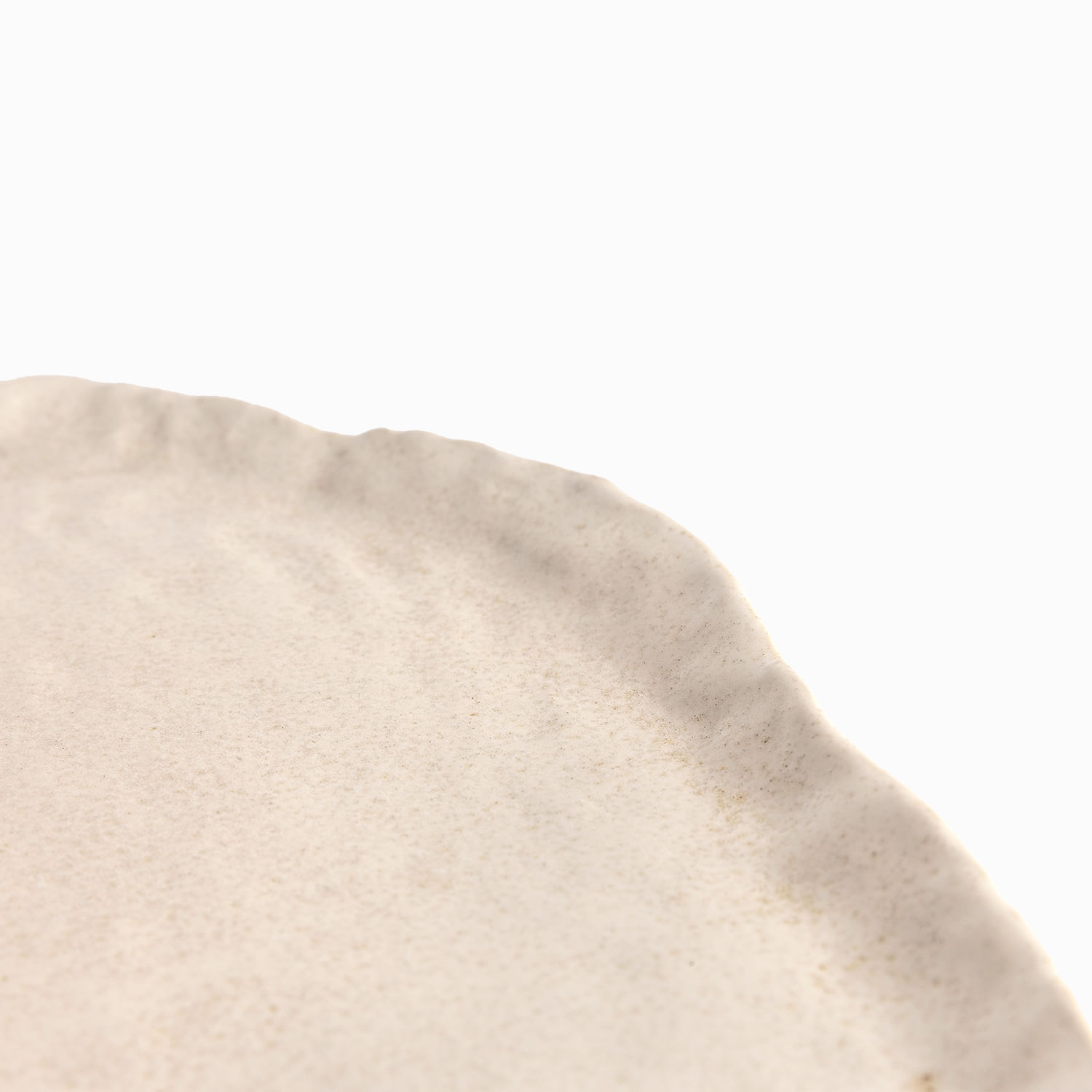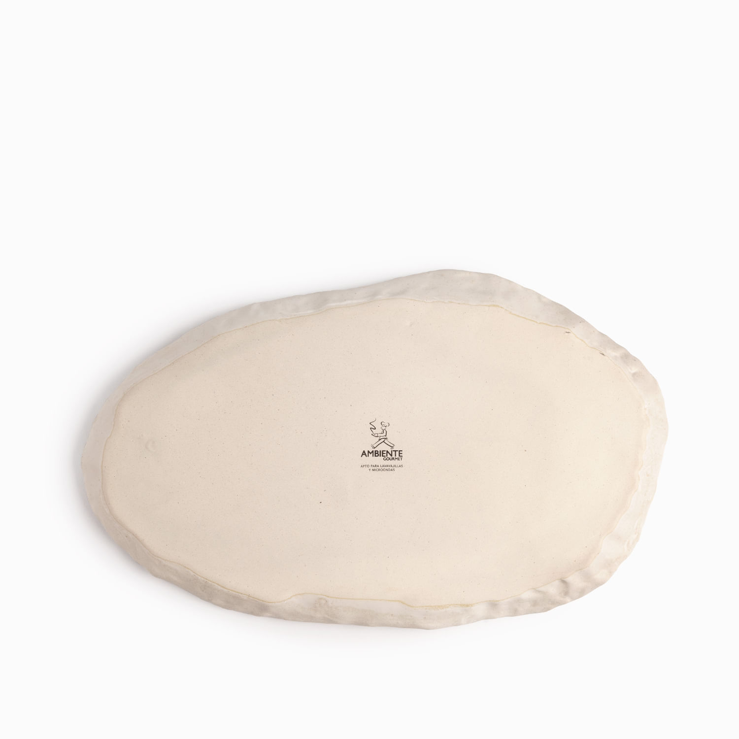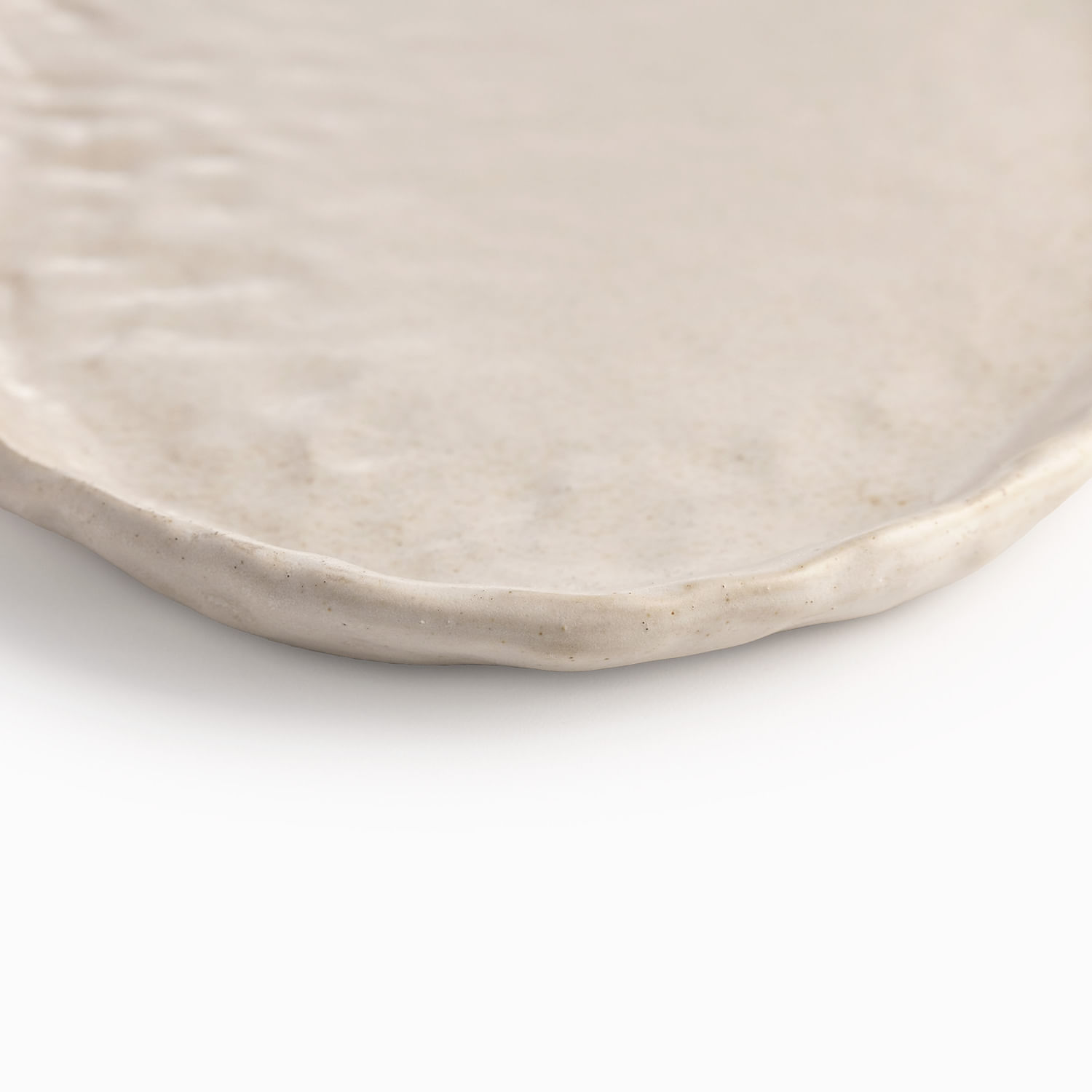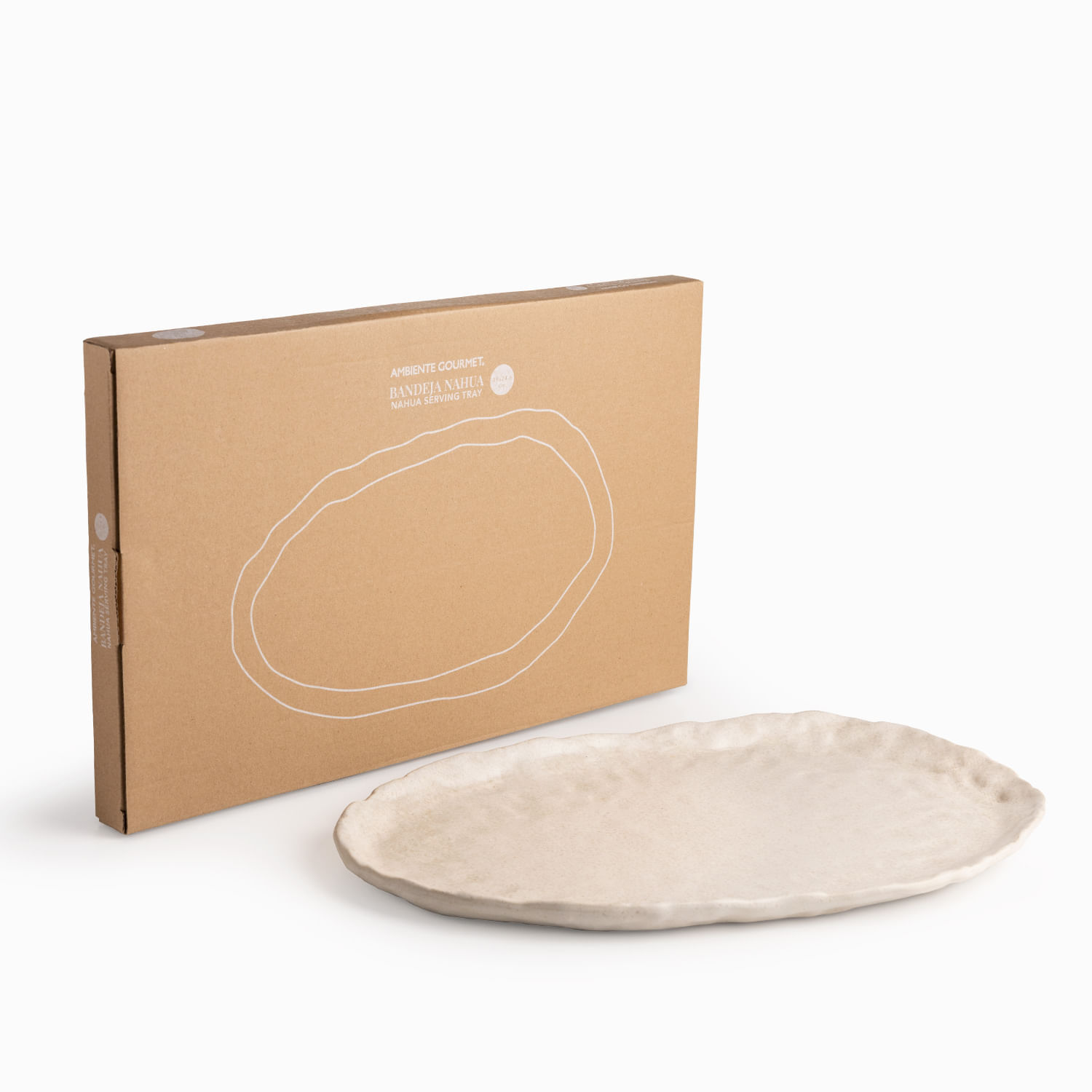 La bandeja Nahua en cerámica destaca por su perfil bajo y estilizado, con una altura de solo 2,5 cm, lo que facilita el acceso a los alimentos y permite una presentación despejada y elegante. Su diseño combina tonalidades crema con detalles artesanales sutiles que aportan calidez a cualquier ambiente. Al igual que el resto de la colección, presenta un acabado con bordes de apariencia irregular que evocan la belleza de las piezas hechas a mano.
