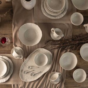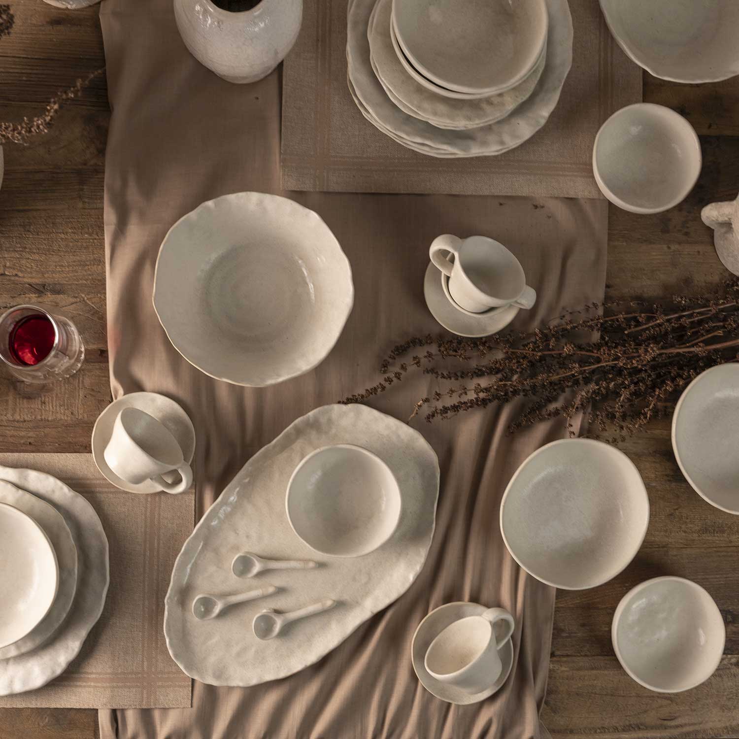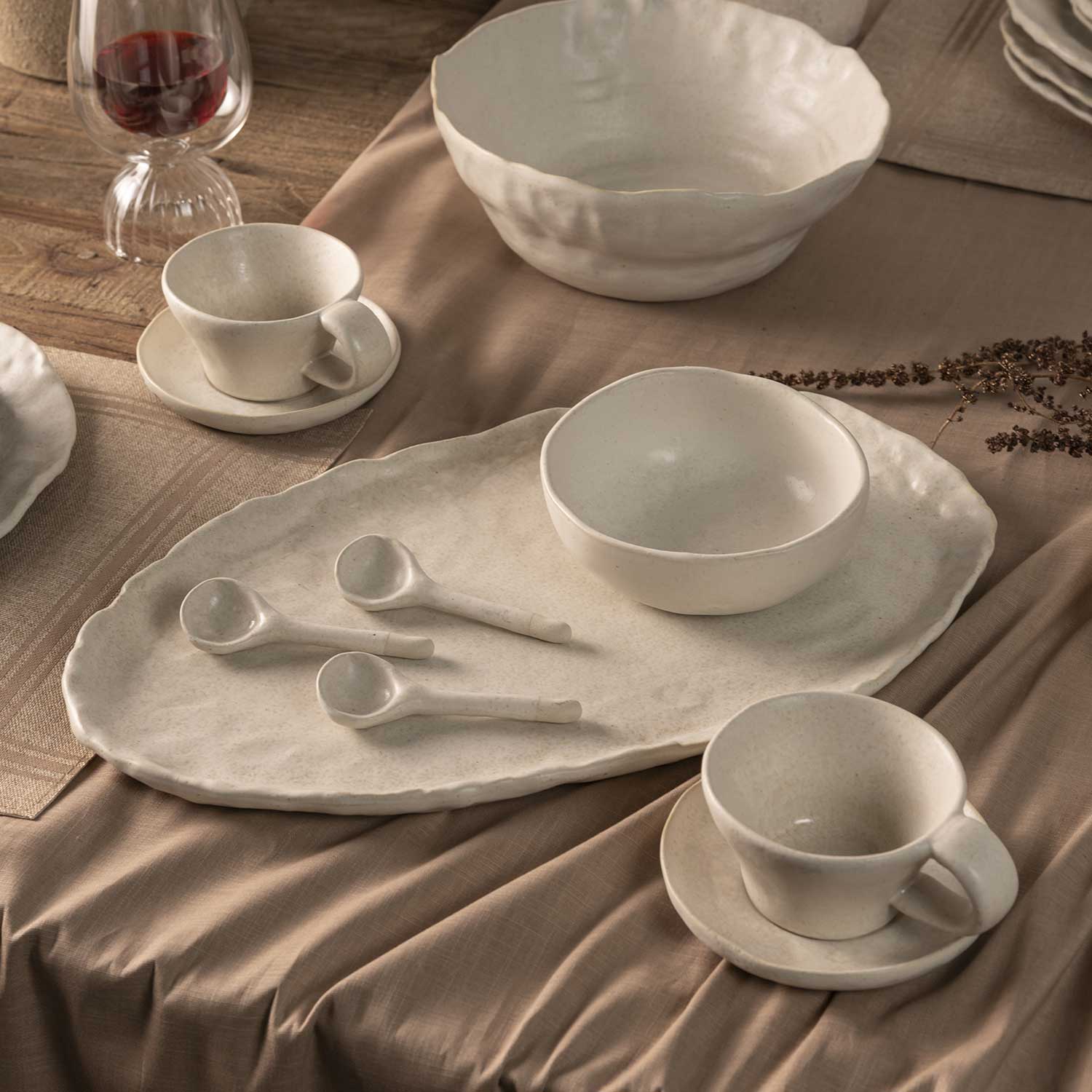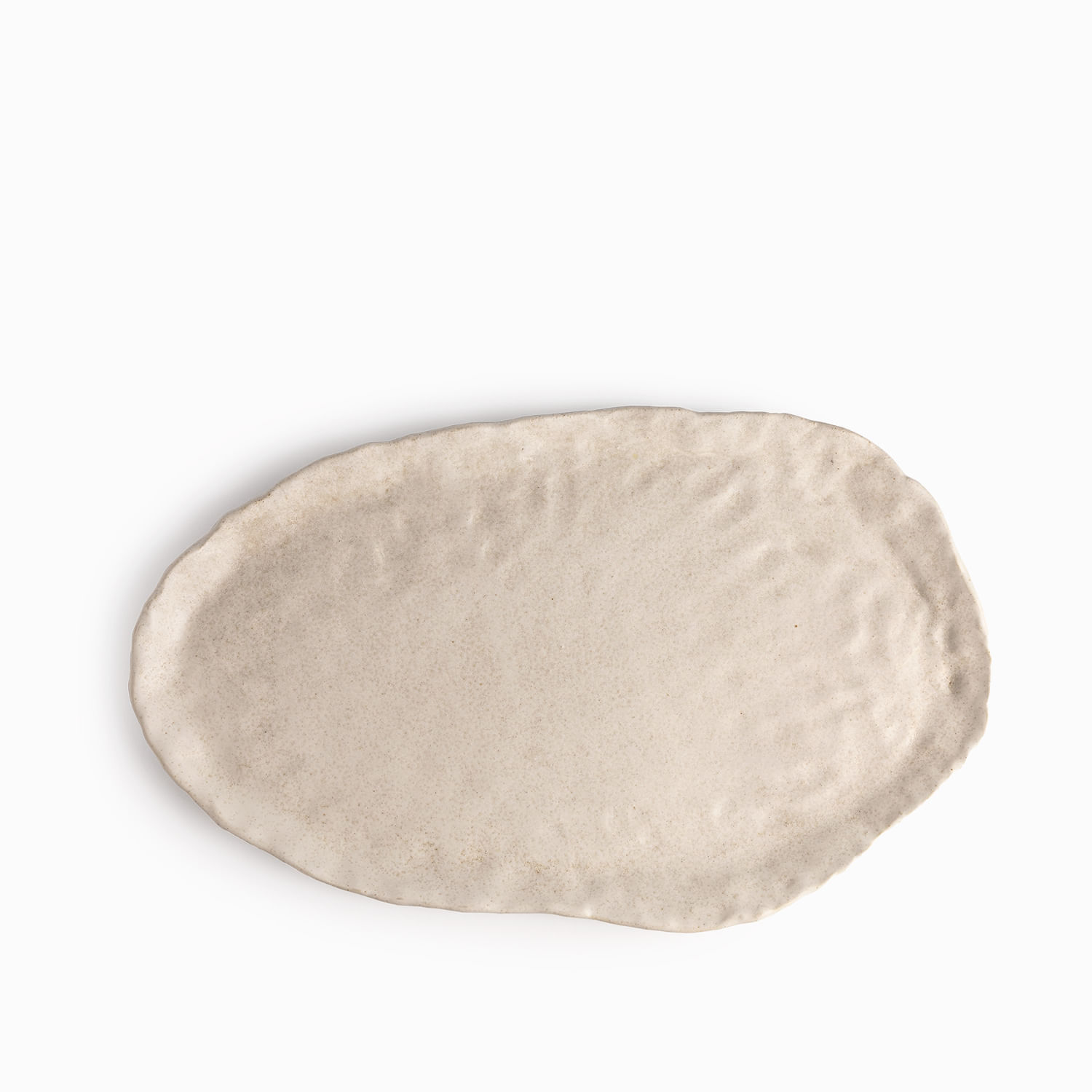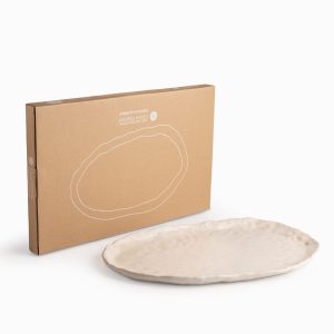 La bandeja Nahua en cerámica destaca por su perfil bajo y estilizado, con una altura de solo 2,5 cm, lo que facilita el acceso a los alimentos y permite una presentación despejada y elegante. Su diseño combina tonalidades crema con detalles artesanales sutiles que aportan calidez a cualquier ambiente. Al igual que el resto de la colección, presenta un acabado con bordes de apariencia irregular que evocan la belleza de las piezas hechas a mano.