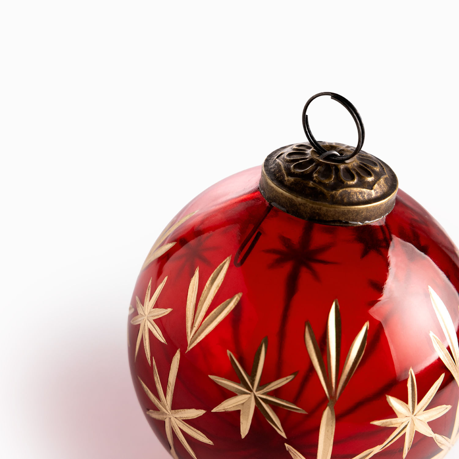 Bola decorativa navideña de vidrio en color dorado con grabados de estrellas. Úsalo para personalizar tu árbol de Navidad y darle un giro a tu decoración con pequeños detalles.