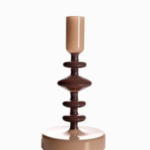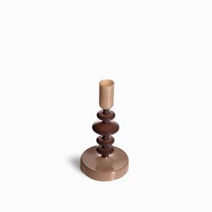 Candelabro decorativo pequeño en vidrio de color gris y café. Destacado por su diseño moderno y contemporáneo que permite adaptarse a diversos espacios y decoraciones como mesas, estudios o bibliotecas. Es la solución ideal para iluminar puntos focales dentro de una habitación según su diseño y tamaño.