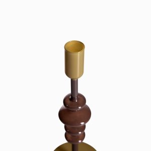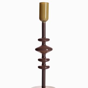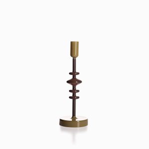 Candelabro decorativo mediano en vidrio de color verde y café. Destacado por su diseño moderno y contemporáneo que permite adaptarse a diversos espacios y decoraciones como mesas, estudios o bibliotecas. Es la solución ideal para iluminar puntos focales dentro de una habitación según su diseño y tamaño.