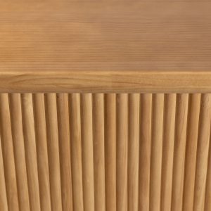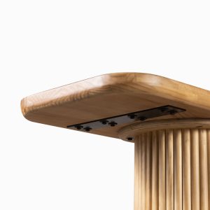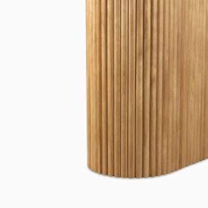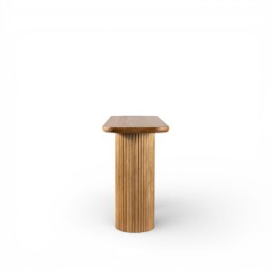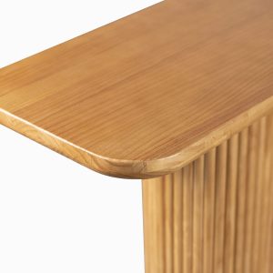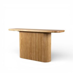La consola en pino destaca por su base central ovalada con un detallado acabado acanalado, que aporta una textura visual única y un toque de modernidad orgánica a cualquier pasillo o salón. Su tablero superior cuenta con bordes suavemente redondeados, ofreciendo un área generosa para exhibir objetos decorativos, lámparas o arte sin perder su perfil esbelto.