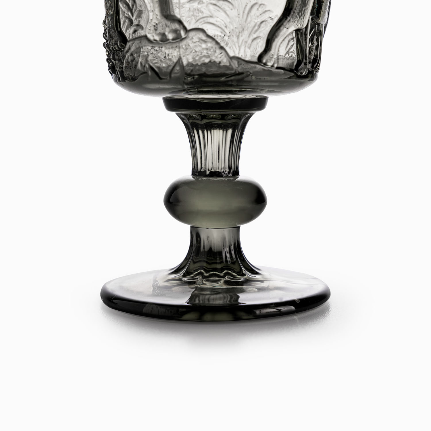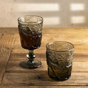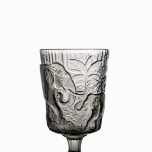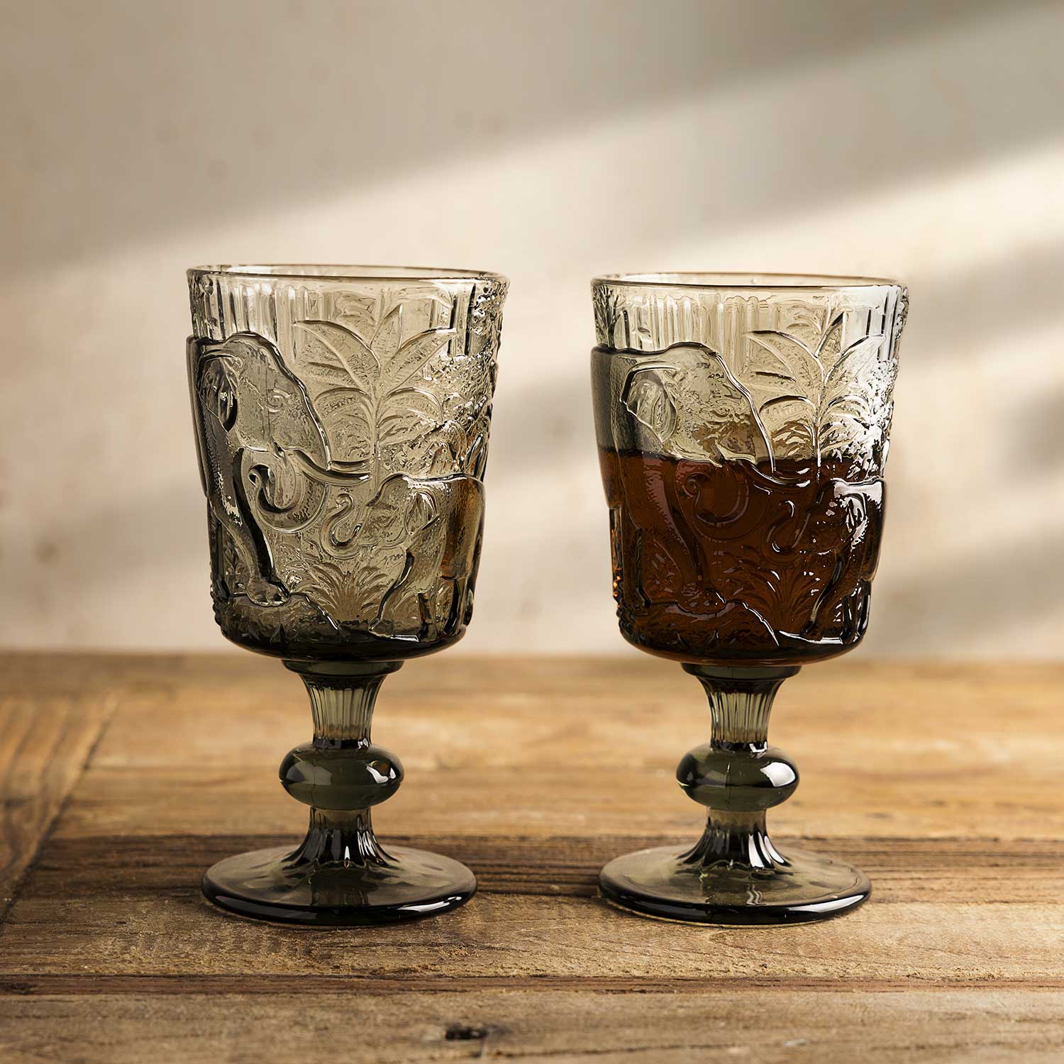 Cada copa de 270ml presenta un delicado grabado de elefantes en relieve, aportando una textura visual y táctil única que se convierte en el centro de atención. El color gris traslúcido añade un aire de modernidad y misterio, alejándose del cristal convencional para ofrecer una mesa con más carácter. Fabricadas en vidrio resistente y duradero, con un peso sólido de 0,4 Kg por pieza que garantiza estabilidad y una sensación premium al tacto.