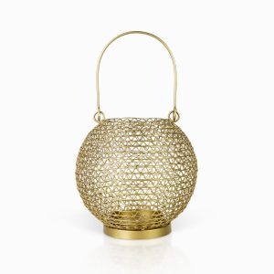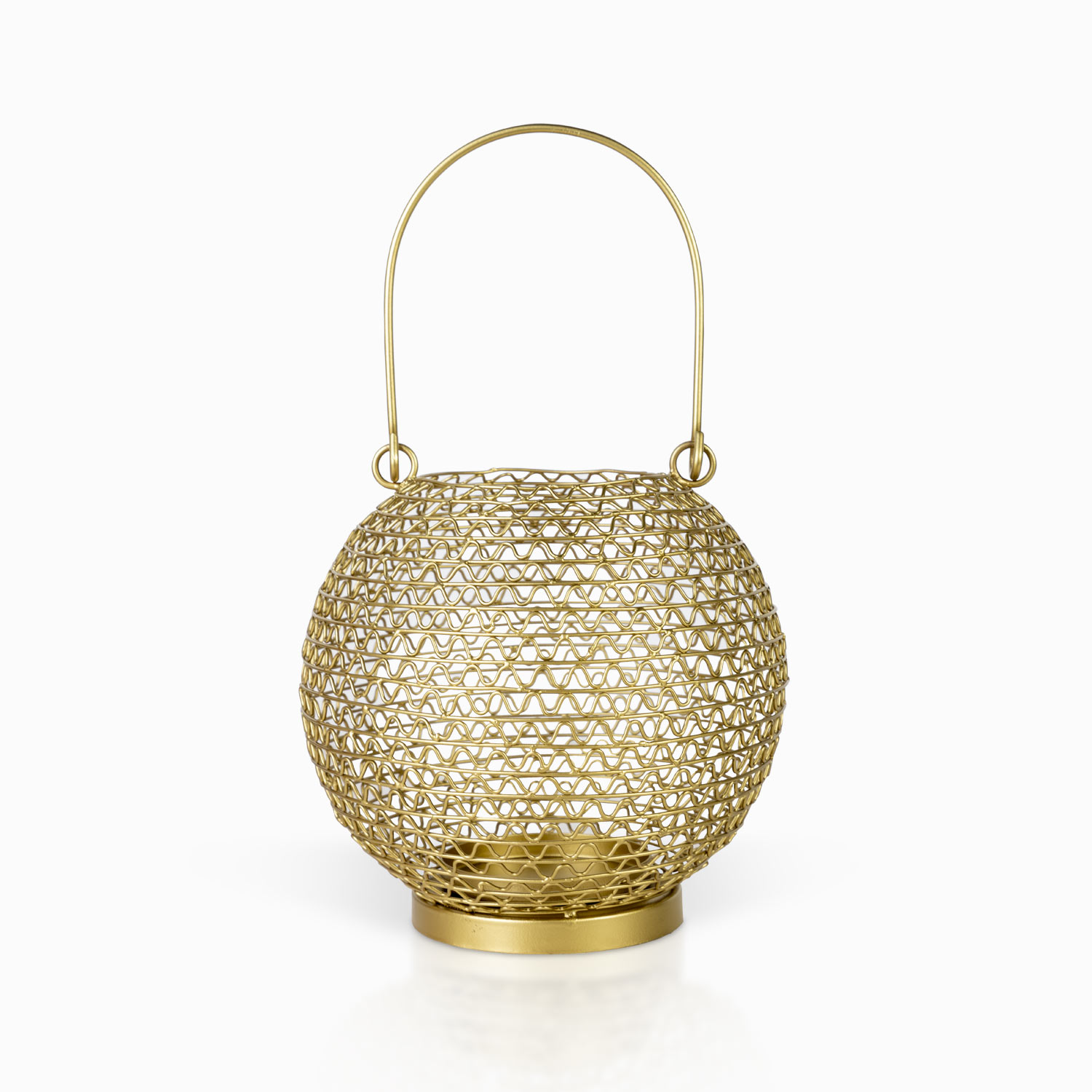 Farol pequeño en acero color dorado en forma de esfera con manija, complementa la decoración y da calidez a los espacios.