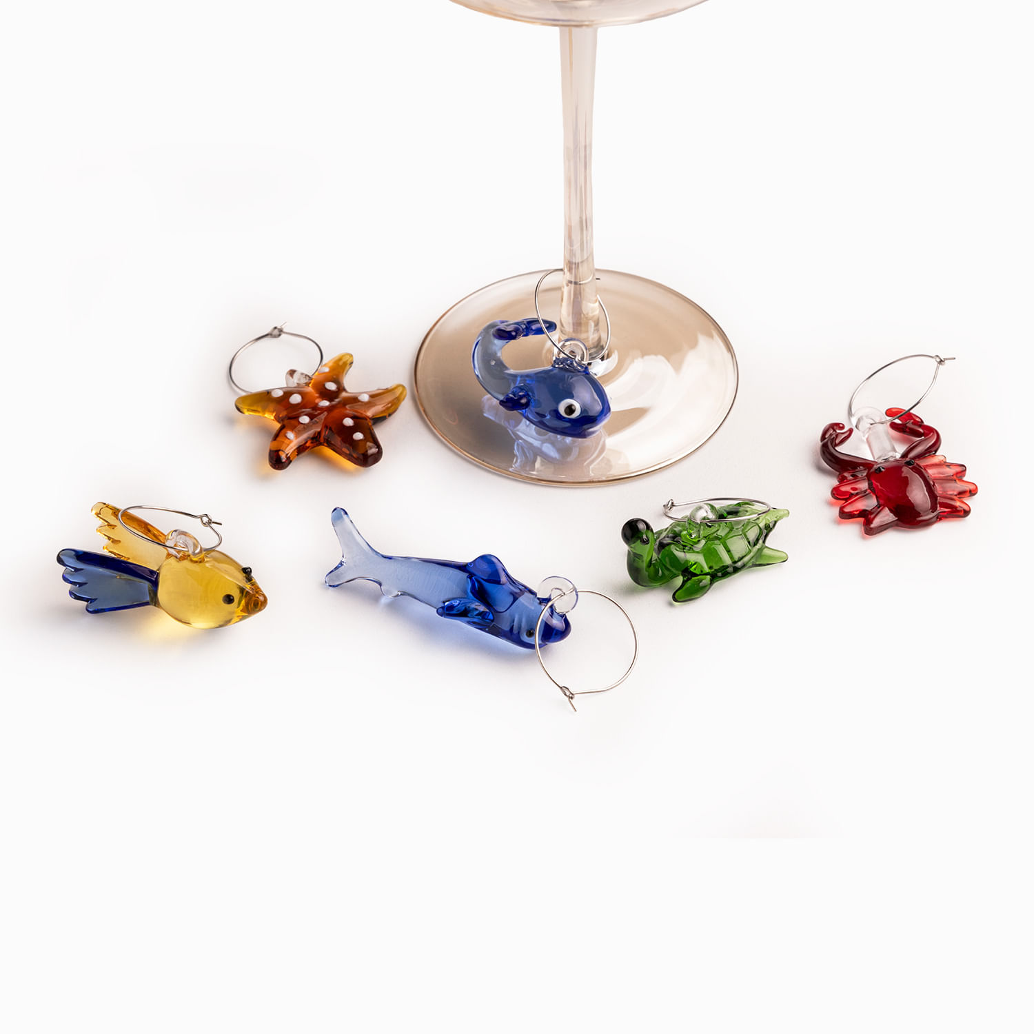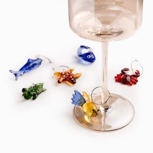 El set incluye 6 figuras miniatura inspiradas en la vida marina (como estrellas de mar, peces y crustáceos), elaboradas con un acabado multicolor vibrante que cautivará a tus invitados. Fabricados en vidrio borosilicato, un material premium reconocido por su ligereza y durabilidad, ideal para piezas de cristalería fina. Olvida la confusión de copas en tus reuniones; estos identificadores permiten que cada invitado reconozca su bebida de forma sencilla y sofisticada. Cada figura cuenta con un aro metálico delgado diseñado para abrazar el tallo de la copa sin rayar el cristal.