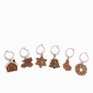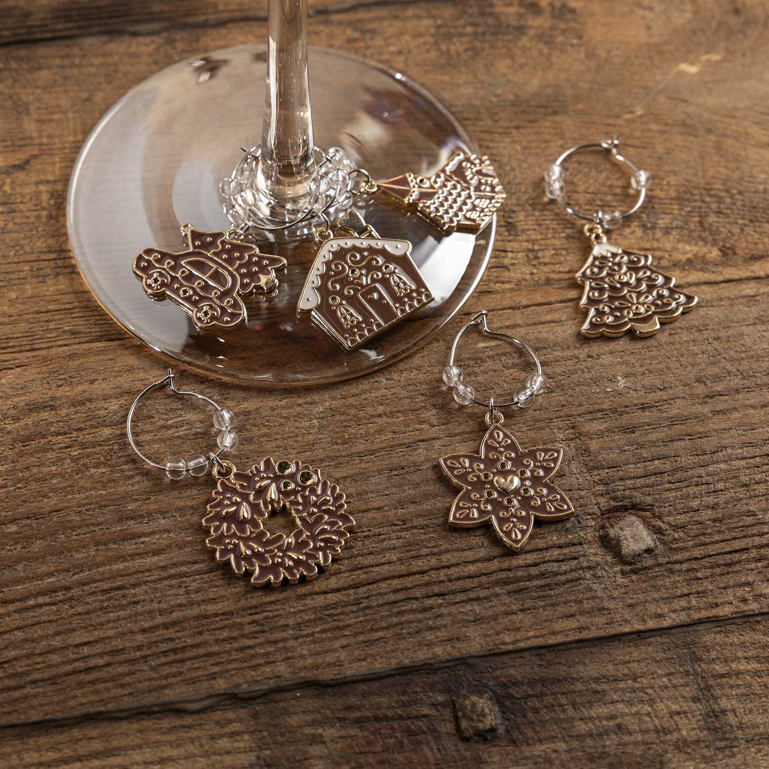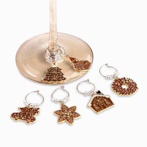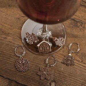 Para que cada invitado identifique su copa por su forma con motivos navideños, vienen seis piezas en aleación y latón. En la copa se usa puesto en el tallo y en el vaso en el borde del mismo.