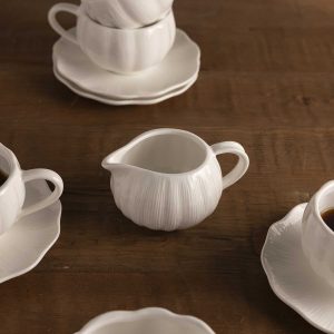 El arte de la mesa se perfecciona con los accesorios adecuados. Esta jarrita Pumpkin es la pieza esencial para servir (350 ml) tus líquidos de forma controlada y con gran estilo. Su diseño inspirado en la calabaza y el acabado en porcelana Blanco aportan una luminosidad y un toque de diseño escultural a tu servicio de café o postres.