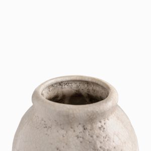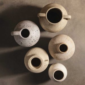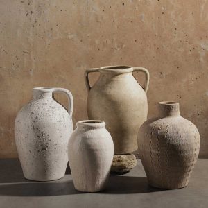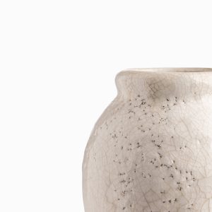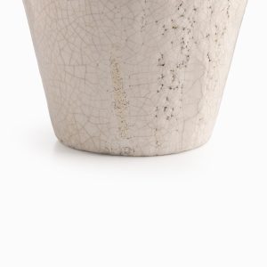 Su diseño incorpora discretas líneas horizontales en relieve que acentúan su forma orgánica. este jarrón en cerámica funciona como un lienzo neutro que resalta el verde de ramas frescas o la calidez de arreglos secos. Es una pieza que aporta textura visual sin recargar el ambiente.