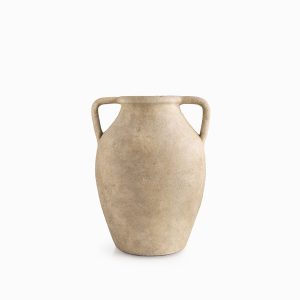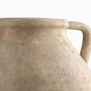 Su superficie posee una textura altamente táctil y granulada en un tono beige arena, aportando una apariencia natural y orgánica que parece esculpida directamente de la piedra. Fabricado íntegramente en cerámica, lo que le otorga una estructura sólida, térmica y de gran durabilidad para embellecer cualquier ambiente. Es el recipiente ideal para lucir ramas secas de gran escala, arreglos de pampa o simplemente para destacar como una escultura independiente.