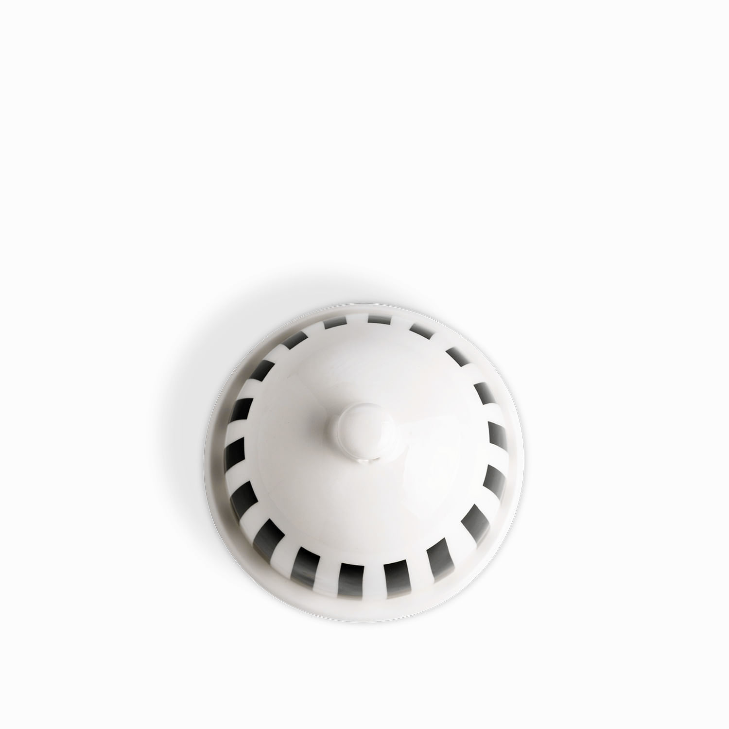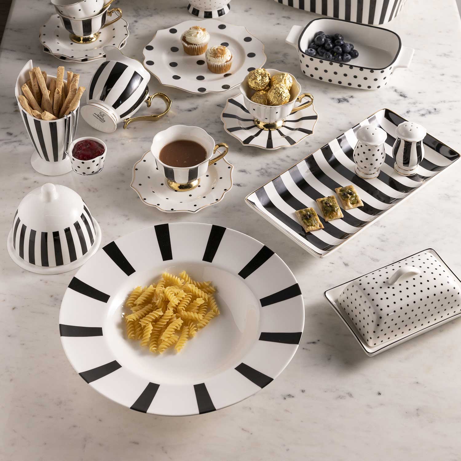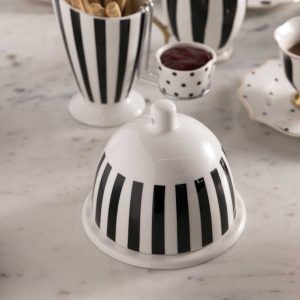 Mantequillera en porcelana de la colección contraste, plato con domo tiene un acabado esmaltado con diseño moderno y llamativo.