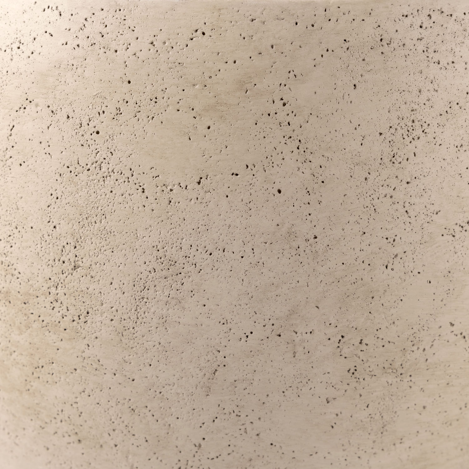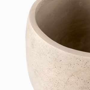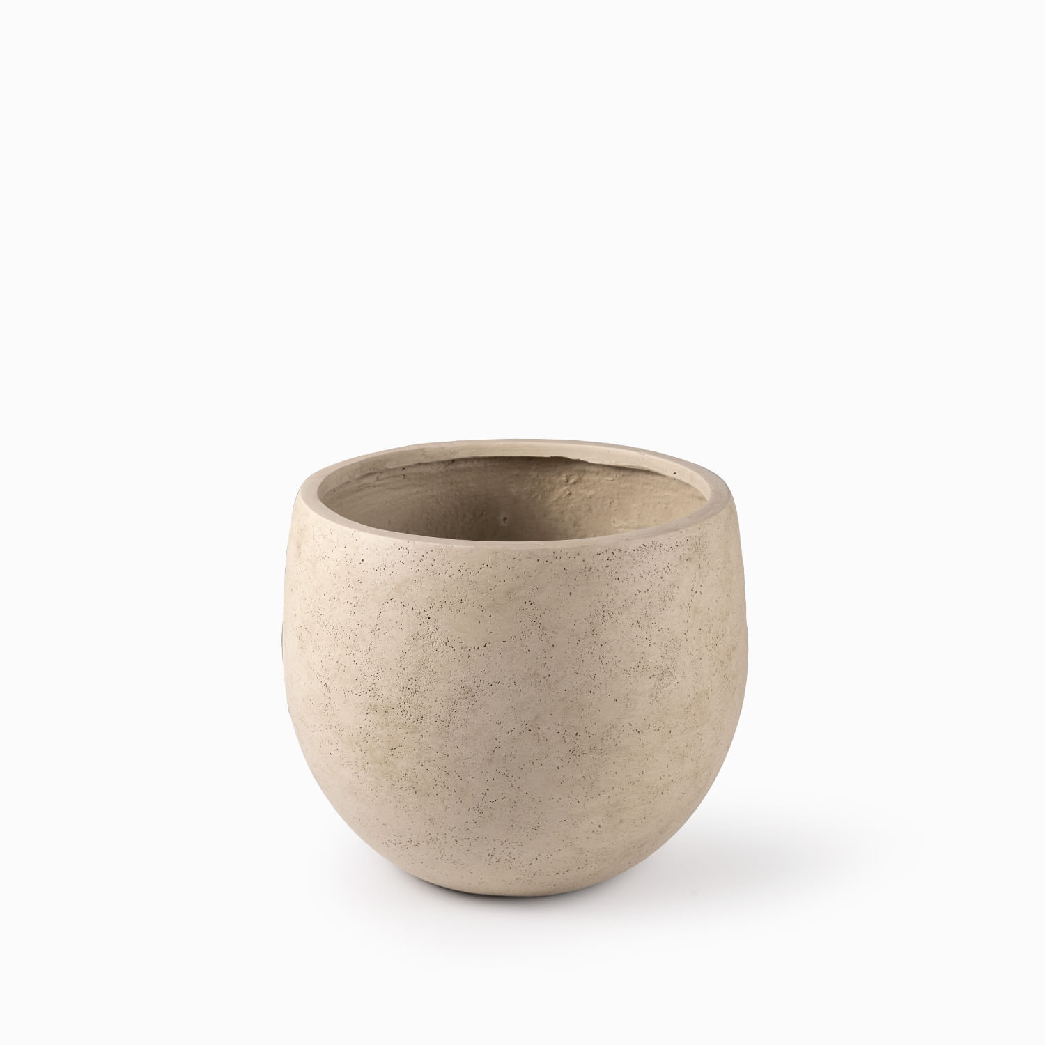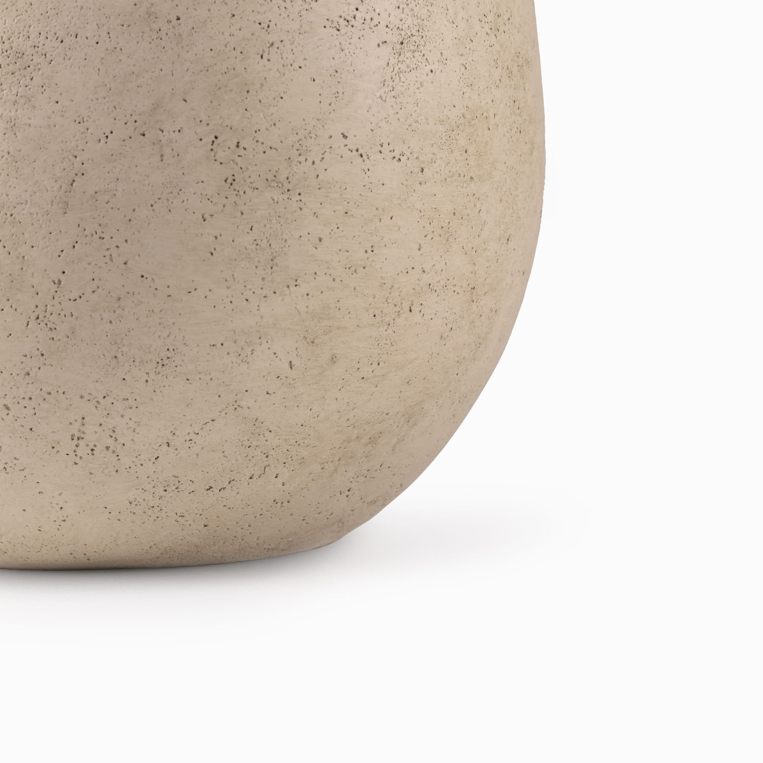 Su acabado en color arena con delicadas motas oscuras emula la belleza natural de la piedra, aportando una calidez orgánica a cualquier ambiente. Presenta un diseño de cuerpo redondeado que suaviza las líneas de la decoración, siendo ideal para ubicarse sobre mesas auxiliares, repisas o directamente en el suelo en composiciones de grupo. Fabricada con una mezcla técnica de 85% cemento ligero (MGO), 10% polvo de piedra y 5% fibra de vidrio, lo que garantiza una pieza duradera y apta para diversos entornos.