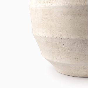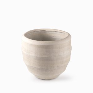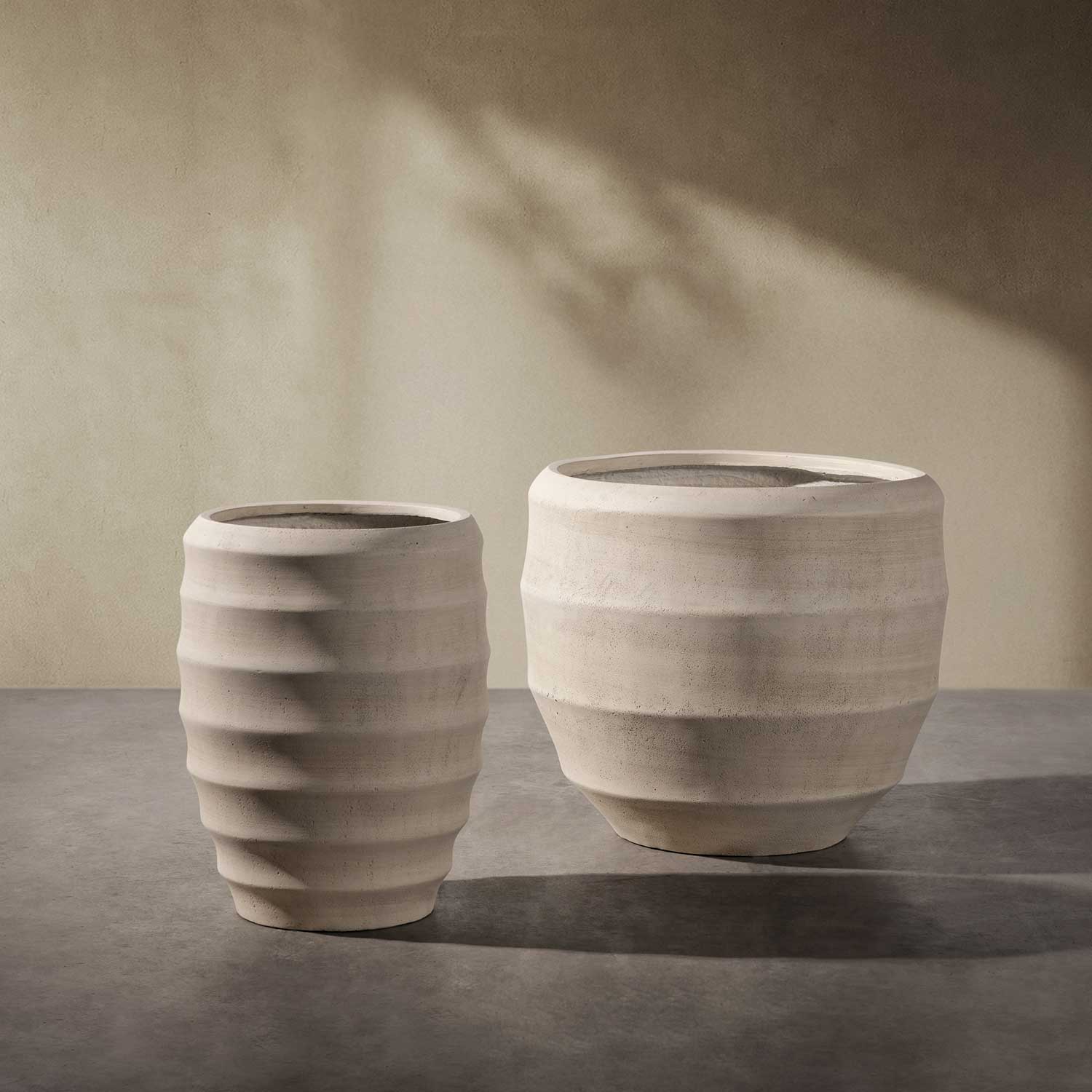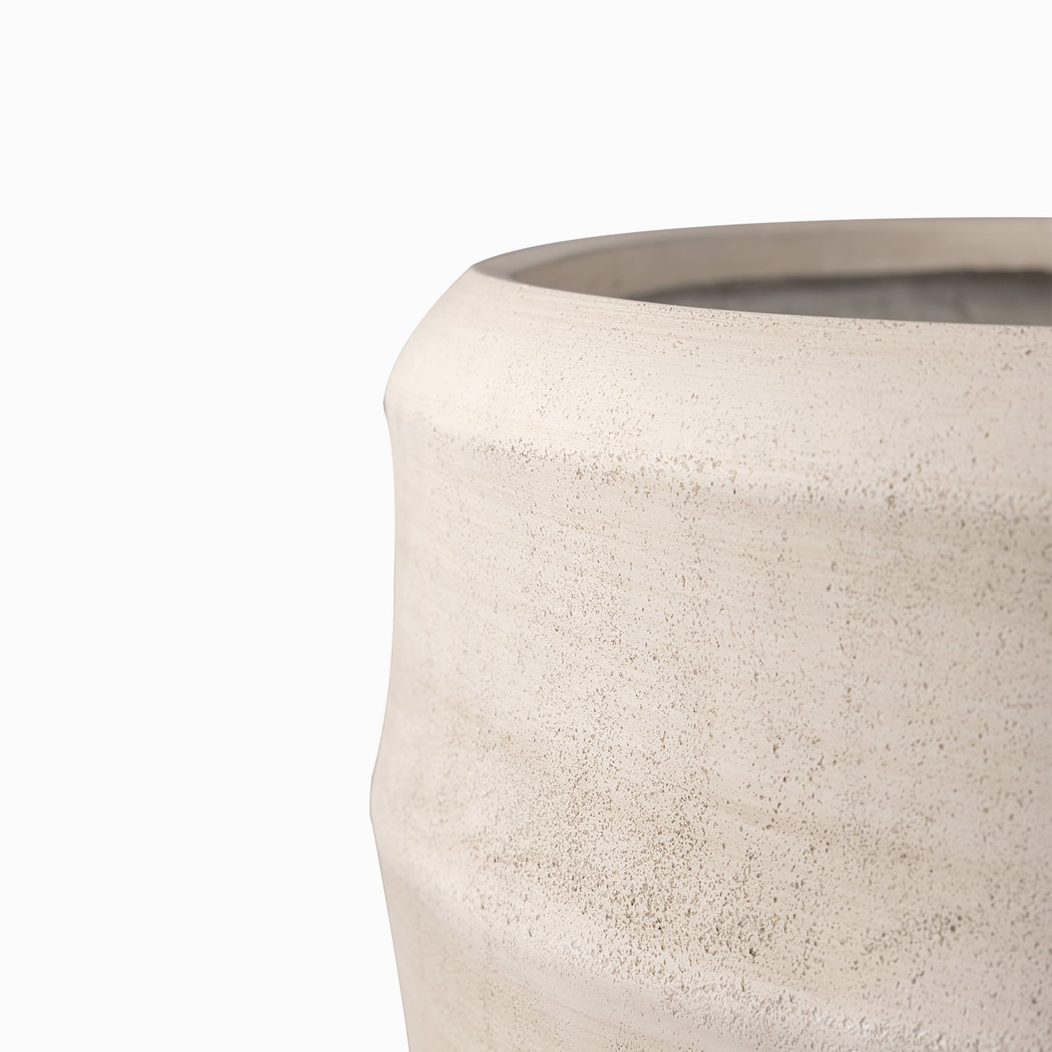 Al igual que el modelo mediano de su línea, esta matera presenta un distintivo cuerpo con anillos horizontales en relieve que aportan dinamismo y un estilo artesanal único. Su tono arena con textura moteada emula la piedra natural, ofreciendo una estética neutra y sofisticada que resalta la belleza de plantas de gran tamaño. Fabricada con una mezcla técnica de 85% cemento ligero (MGO), 10% de polvo de piedra y 5% de fibra de vidrio, lo que garantiza una durabilidad superior tanto en interiores como en exteriores protegidos.