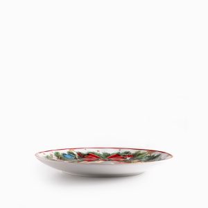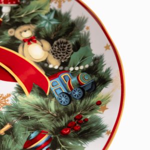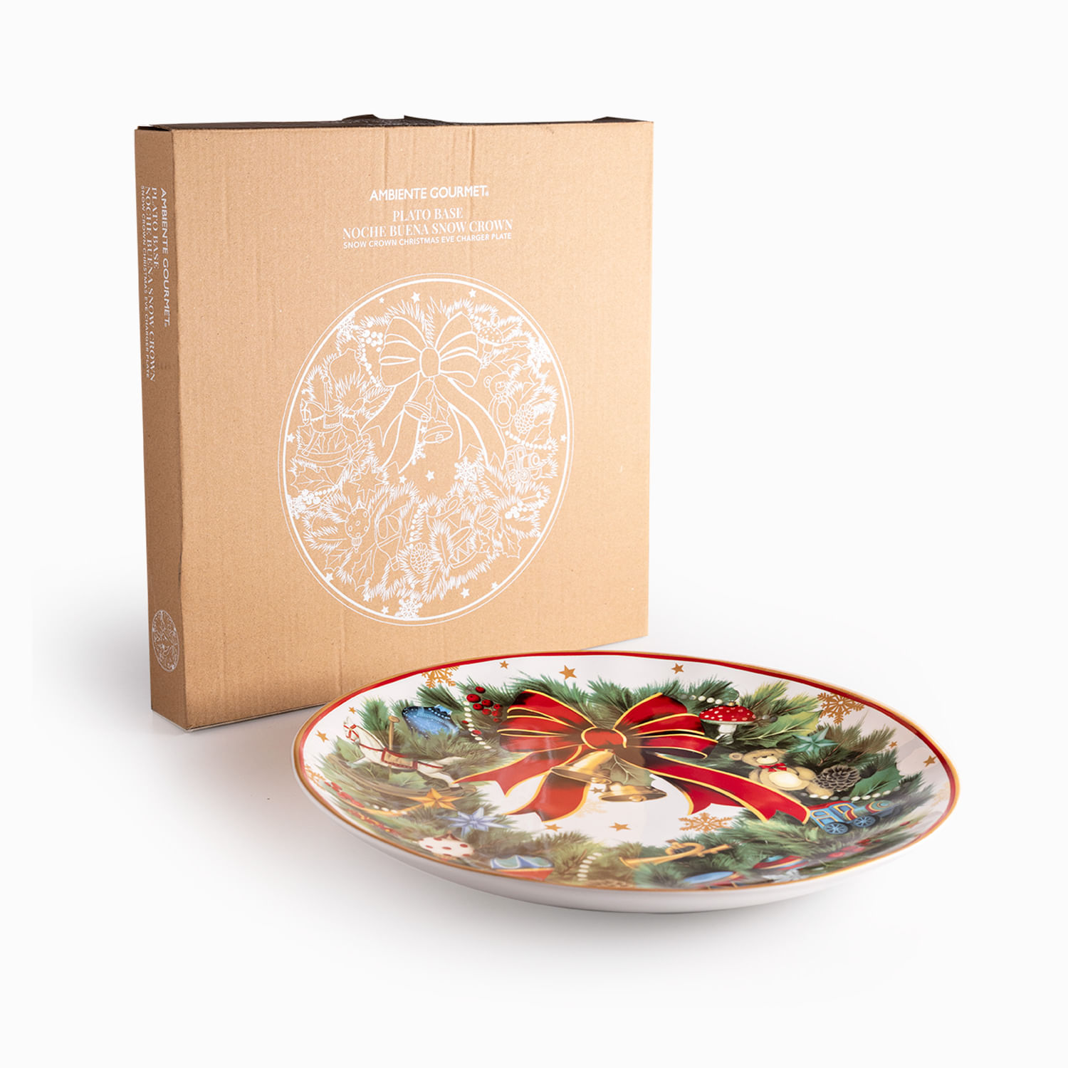Plato base para servir de la colección Noche Buena Snow Crown con un estilo festivo y encantador. Fabricado en porcelana, este plato no solo es decorativo, sino también funcional. Es ideal para servir alimentos en las reuniones navideñas. Su decoración captura el espíritu navideño, enmarcada por detalles dorados que realzan su elegancia.