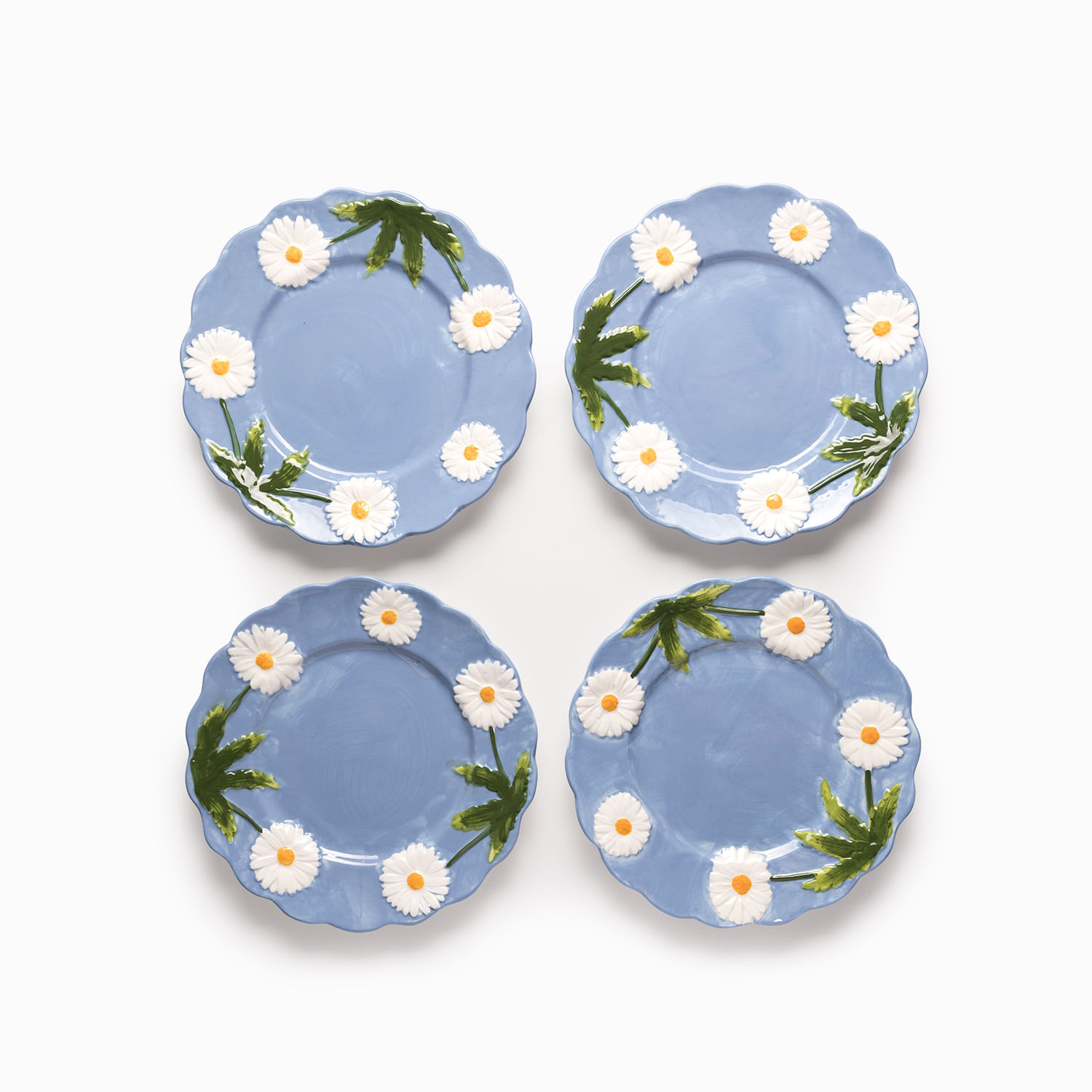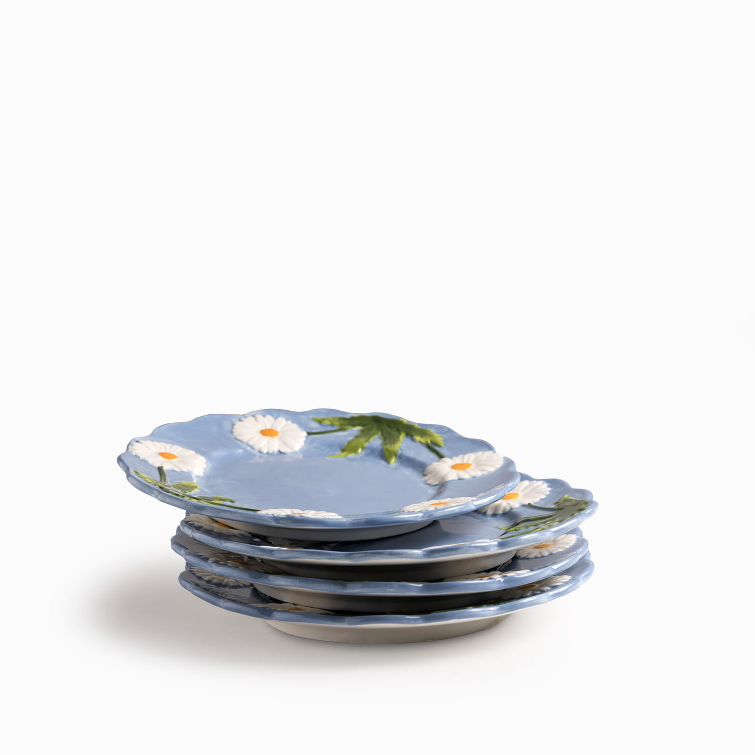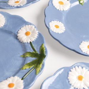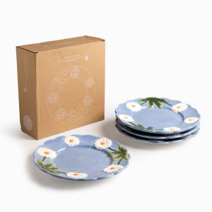 El plato mediano Margarita presenta un borde ondulado que sigue la silueta de los pétalos, reforzando su carácter orgánico y artesanal. Fabricado en dolomita, un material cerámico conocido por permitir detalles escultóricos precisos y colores muy vivos, ideal para piezas decorativas y de servicio. El azul profundo del fondo resalta la blancura de los pétalos y el verde de las hojas, aportando una estética mediterránea o campestre a tu comedor. Viene en práctico set x4, con un diámetro de 22 cm, tiene las dimensiones perfectas para servir entradas, ensaladas, postres o para ser el plato estrella en un brunch al aire libre.