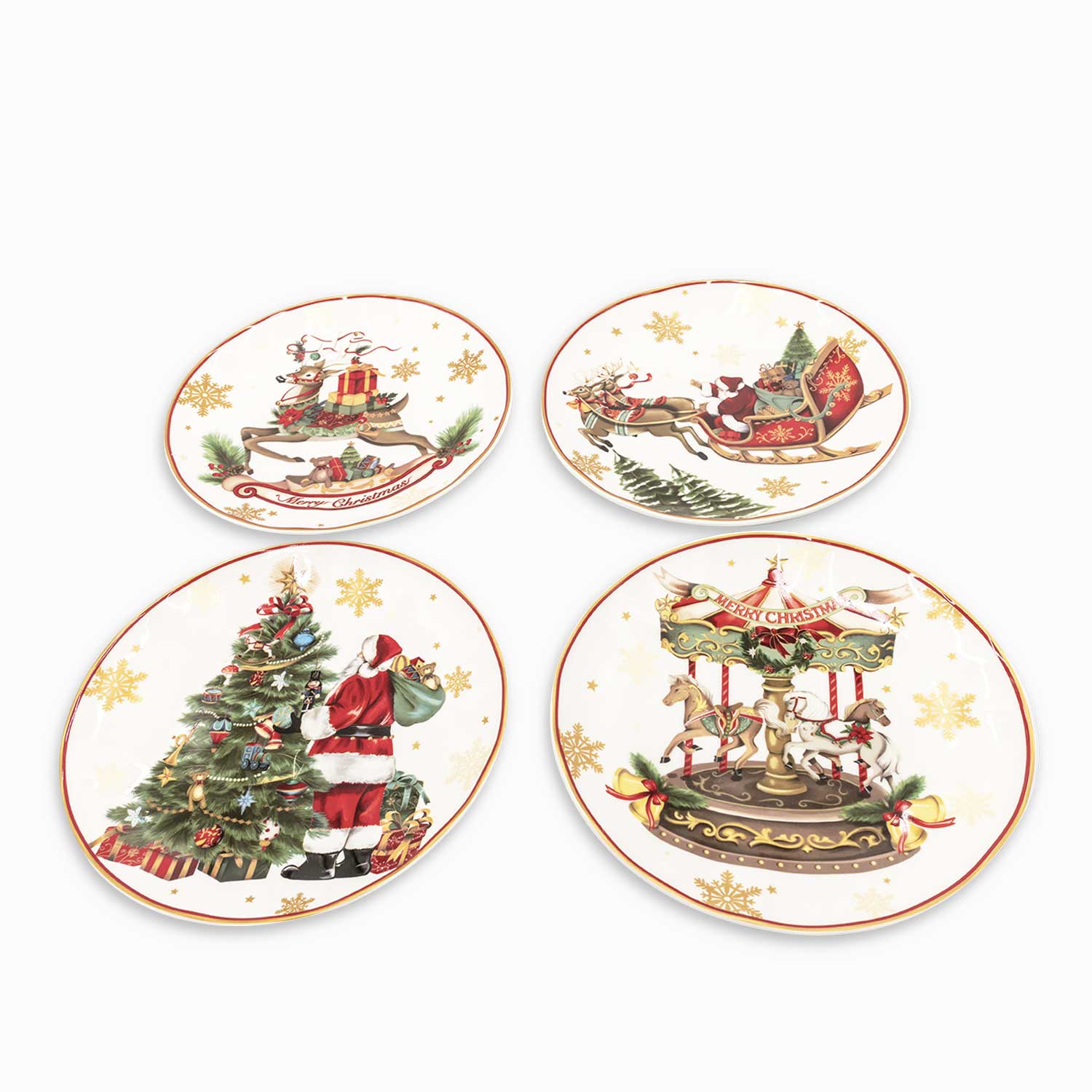 Set x cuatro (4) platos medianos para servir de la colección Noche Buena Snow con un estilo festivo y encantador. Fabricados en cerámica, estos platos no solo son decorativos, sino también funcionales. Ideales para servir alimentos en las reuniones navideñas. Su decoración captura el espíritu navideño, enmarcada por detalles dorados que realzan su elegancia.