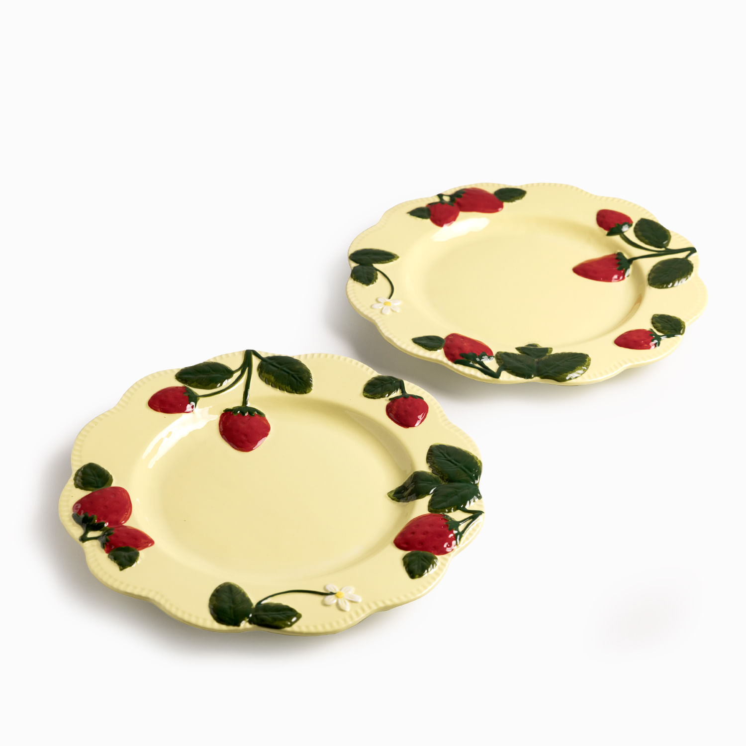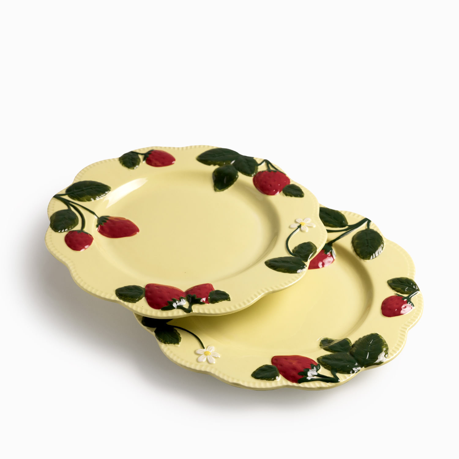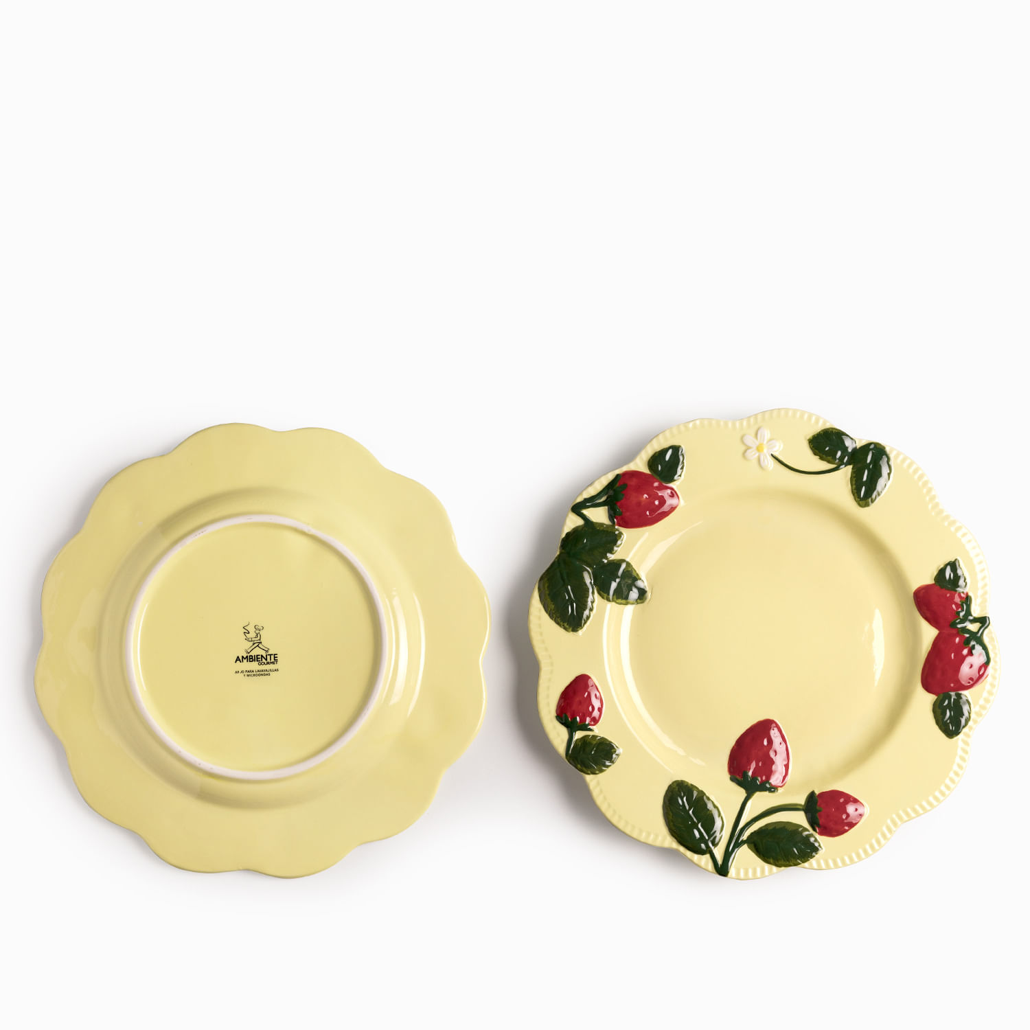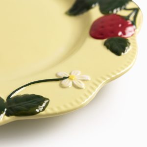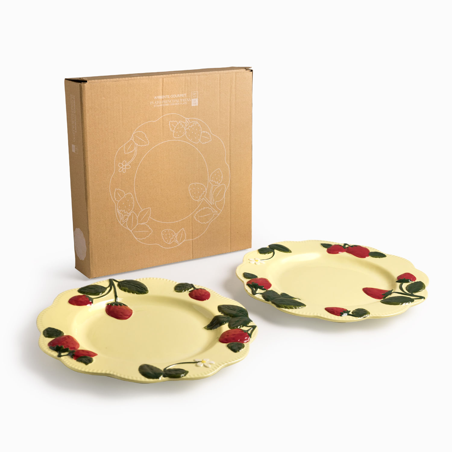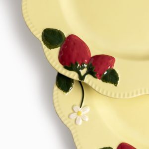 El plato principal Fresa destaca por su borde ondulado que sigue la línea orgánica de la colección, decorado con fresas rojas y hojas verdes en relieve, creando una mesa llena de vida y frescura, el manejo de la cerámica hace que cada pieza se sienta artesanal. Se ofrece como un set x2, permitiéndote complementar tu colección de forma práctica.