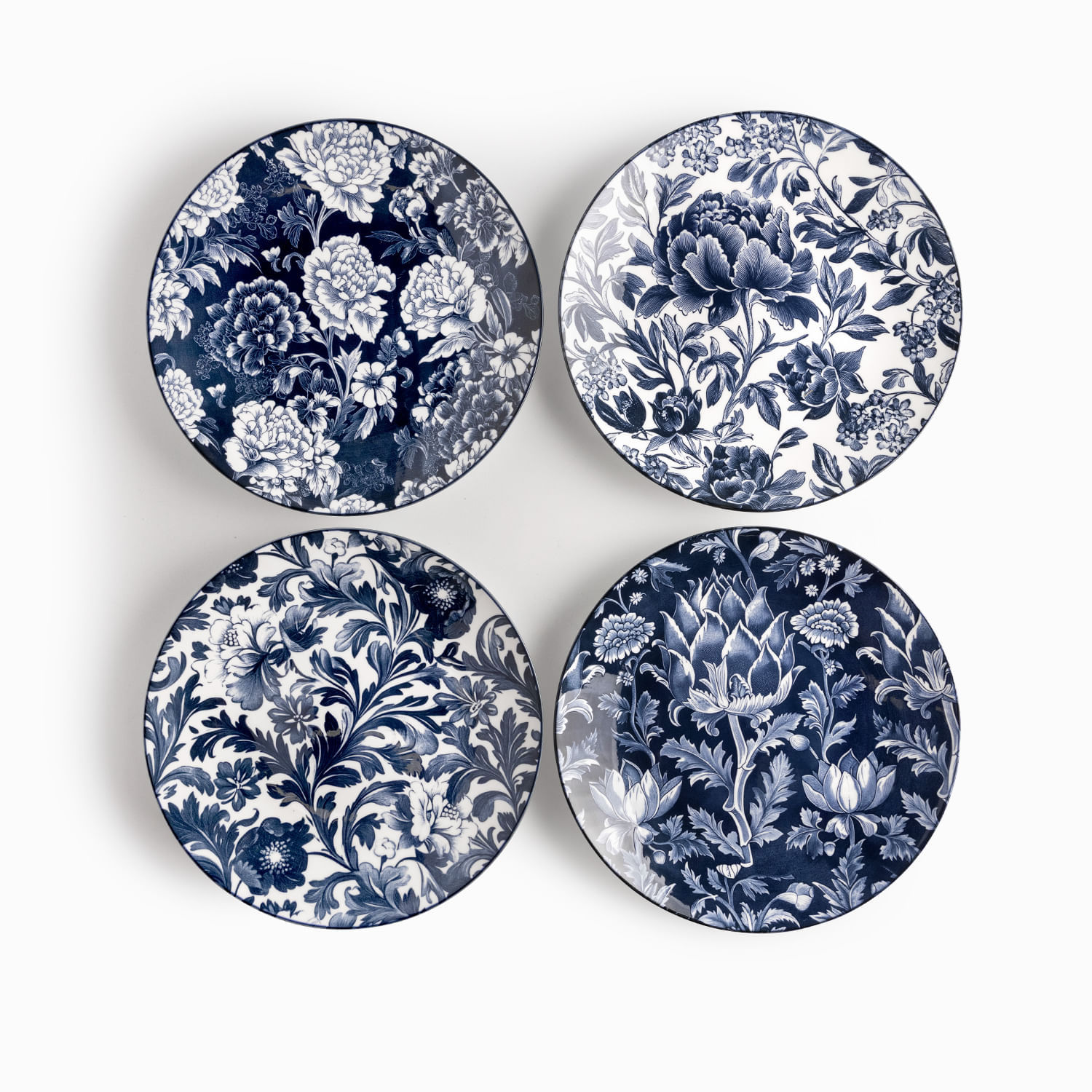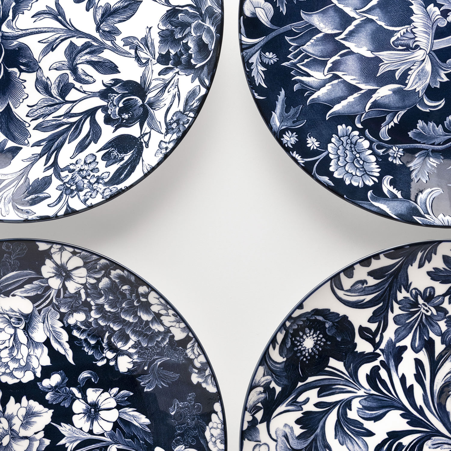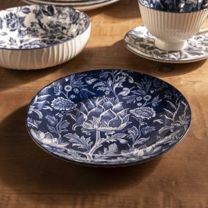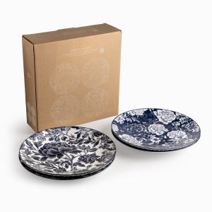 Cada plato presenta un refinado estampado botánico en tonos azules, evocando la sofisticación de la cerámica tradicional y aportando un aire de distinción a tus cenas y almuerzos. Tiene la superficie ideal para presentar platos principales complejos, la presentación en Set x4 asegura uniformidad en tu vajilla.