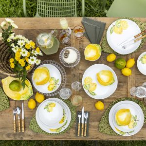 El plato principal Limones ha sido diseñado para quienes buscan la belleza de la practicidad en la melamina, tiene una superficie blanca decorada con un vibrante motivo de limones y hojas verdes en uno de sus costados, aportando un toque artístico y refrescante a tus comidas. Con un diámetro de 28 cm, proporciona el espacio perfecto para servir platos fuertes, pastas o ensaladas abundantes con una presentación