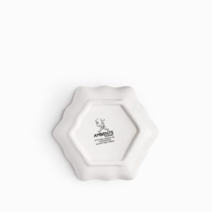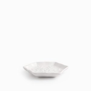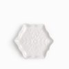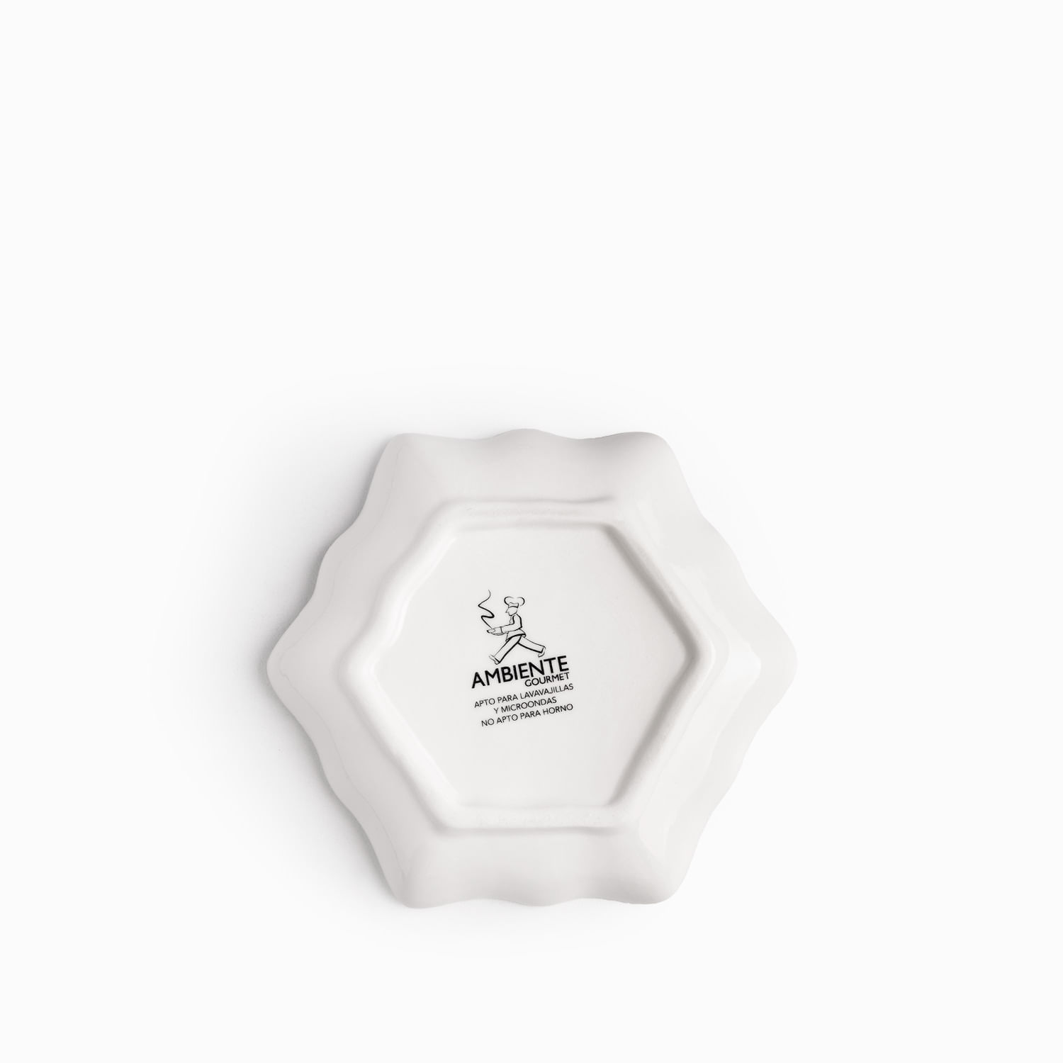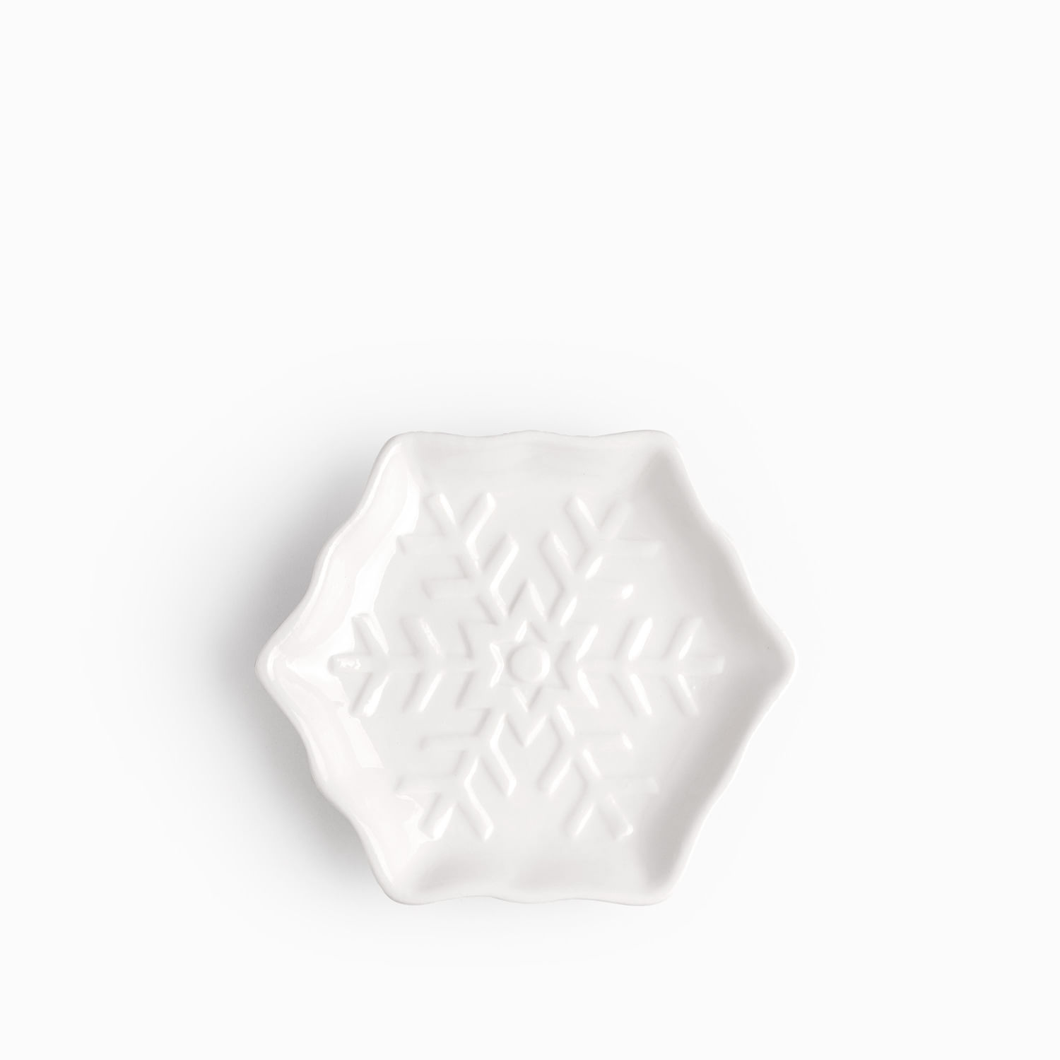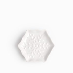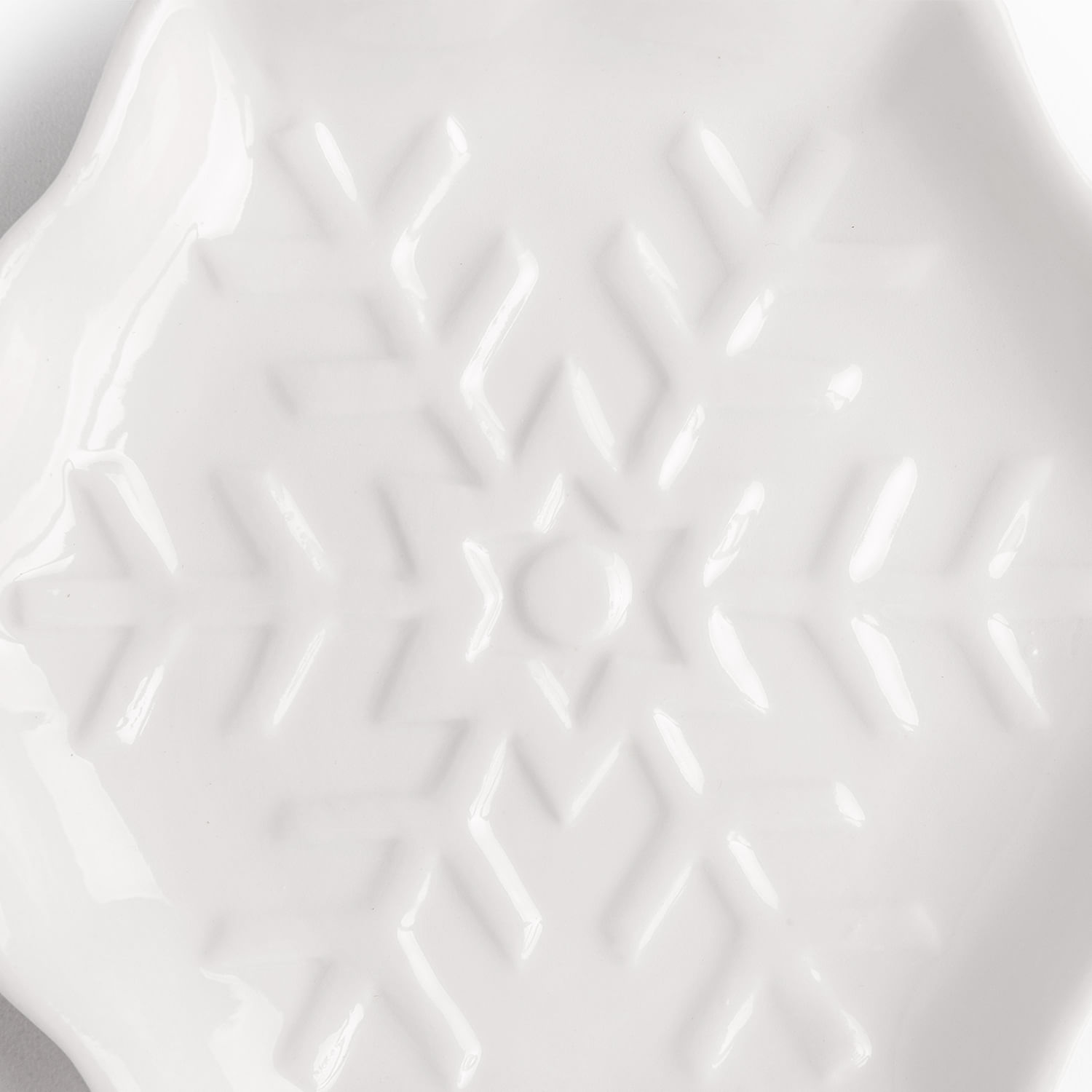 Plato decorativo pequeño de cerámica, con forma de copo de nieve. Ideal para servir dulces navideños, este plato se integra perfectamente con la decoración de la mesa en fiestas especiales.