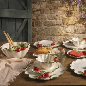 El plato Tomatella destaca por su capacidad de transformar una comida cotidiana en una celebración visual. Para servir pastas, ensaladas frescas o como bandeja para aperitivos. Su combinación cromática armoniza perfectamente con manteles de lino, maderas naturales y otros accesorios de la línea botánica. Fabricado en cerámica, lo que garantiza una superficie lisa, higiénica y con un brillo natural que realza los colores del diseño.