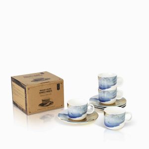 Pocillo en cerámica de 220ml, de la colección Acuarela Oro Turquesa, este es un juego de pocillo y plato ideal para servir bebidas calientes, después de la comida.