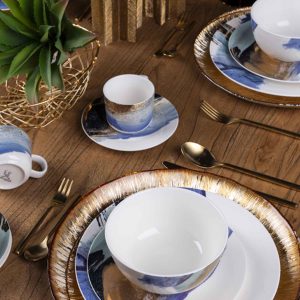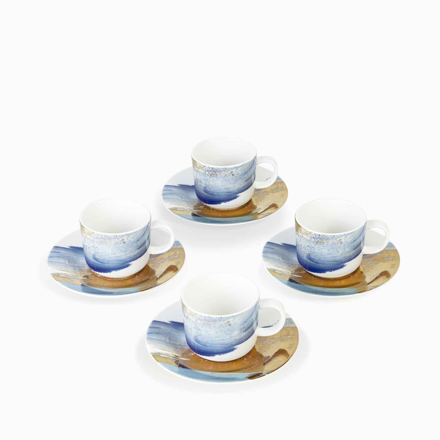 Set de 8 piezas para 4 juegos de taza y plato para bebidas calientes. Fascinantes pinceladas doradas y azules decoran con mucho estilo las piezas de la colección Acuarela Oro Turquesa. Esta vajilla delicada y elegante, es fabricada en un material de alta blancura conocido como New Bone China. Se trata de un tipo de pasta de porcelana de dureza superior y elevada resistencia a los golpes, catalogada como una de las mas nobles y mejores en su tipo. Acuarela Oro Turquesa es una vajilla para compartir con libertad y sin preocupaciones, no solo es hermosa sino también práctica.