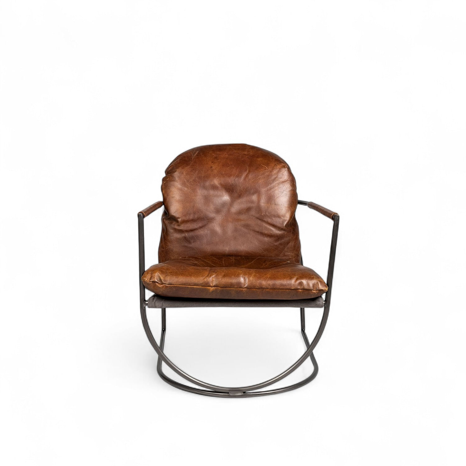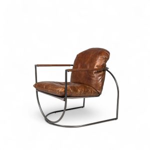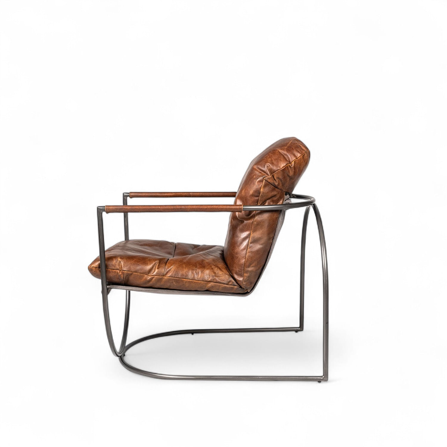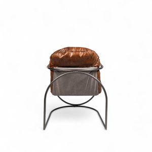 Poltrona de estilo moderno y disruptivo en cuero color miel, con gran trabajo artesanal, puede utilizarse en el comedor o en la sala. Sus patas marcan la diferencia por si diseño en u.