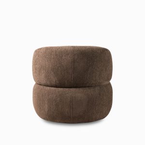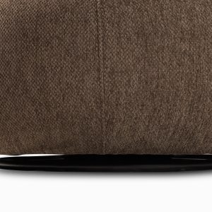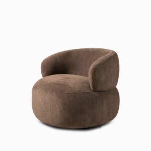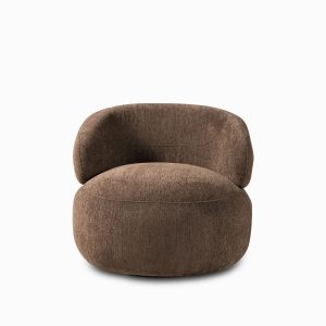 Poltrona giratoria de color chocolate con atributos redondeados y geométricos de la colección Emilia. Con relleno de espuma, tapizado en poliéster y respaldo acolchado que garantizan confort y atemporalidad. Aporta carácter y sofisticación a cualquier entorno, adaptándose a los diversos ambientes con su diseño minimalista y diferenciado.