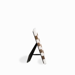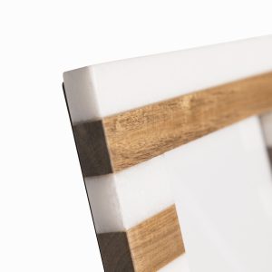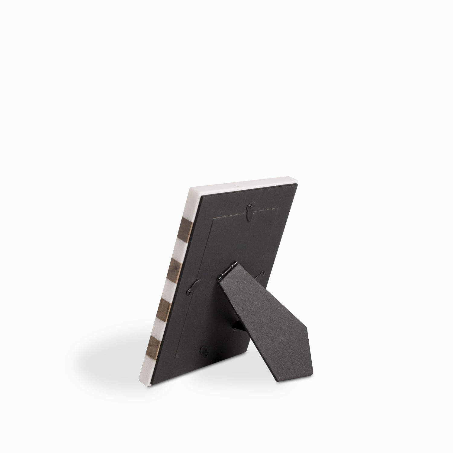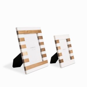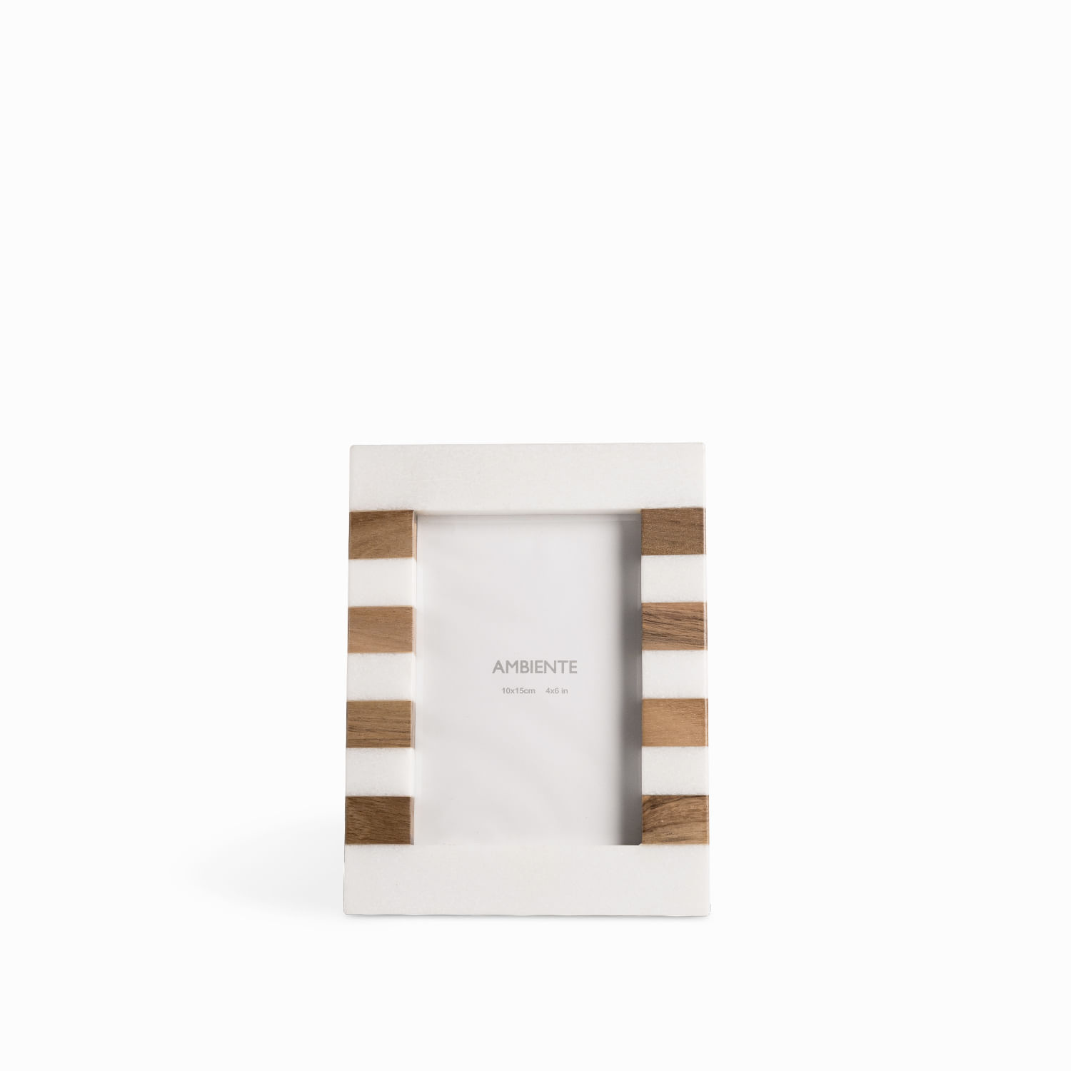Portarretrato con marco en madera y mármol de 21cm con líneas, elegante pieza decorativa que combina la belleza natural de la acacia con las vetas de la piedra natural. Ideal para atesorar recuerdos fotográficos con pequeños detalles de diseño.