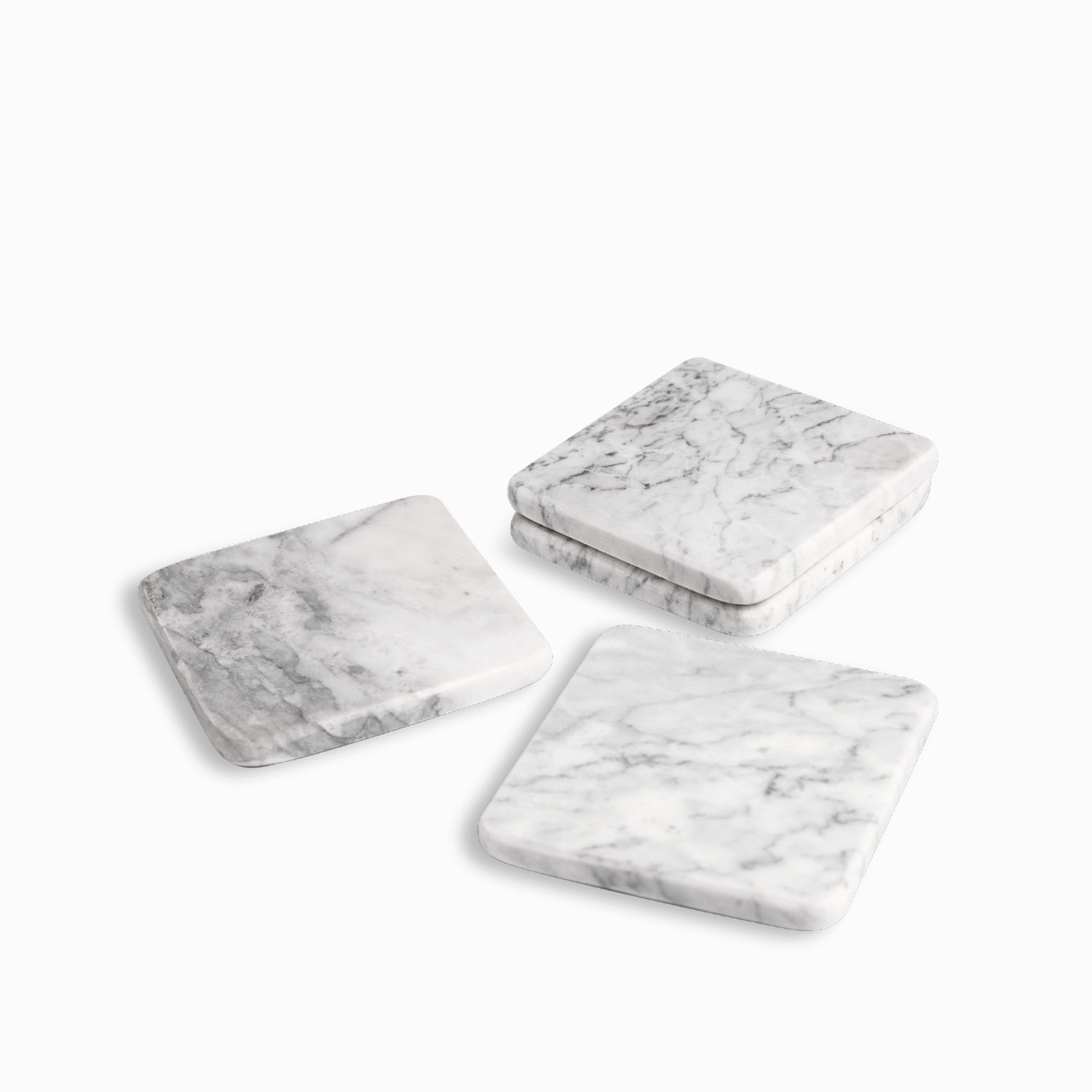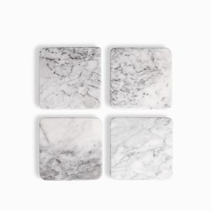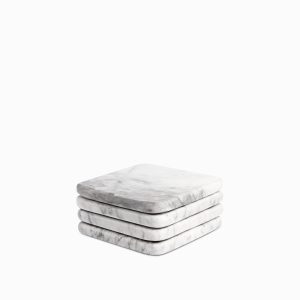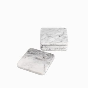 Juego de posavasos en mármol, sirven para soportar bebidas heladas y calientes en todo tipo de superficies, protegiendo los muebles de regueros, manchas y rasguños. Por su material la piedra presenta diferentes detalles en cada pieza.