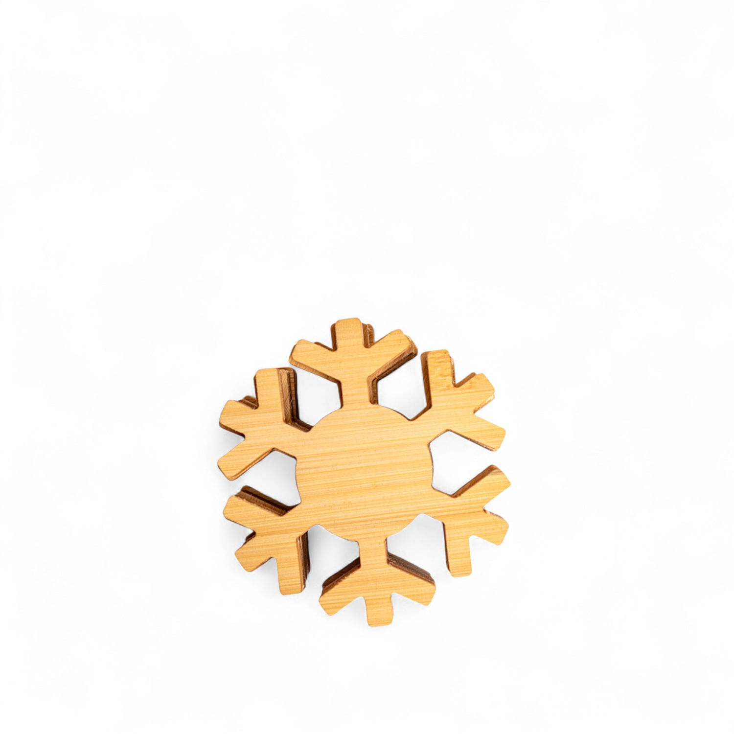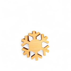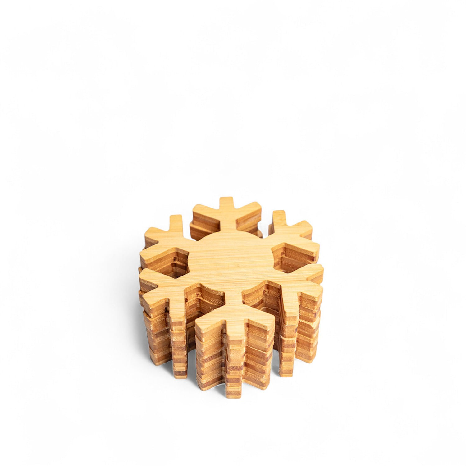 Set de cinco (5) posavasos en madera con figura de copo de nieve, ligeros y antiadherentes. Sirven para soportar bebidas heladas y calientes en todo tipo de superficies, protegiendo los muebles de regueros, manchas y rasguños.