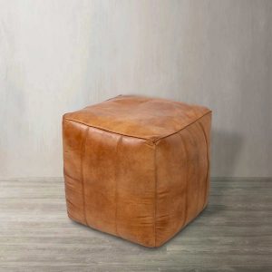 Puff elaborado en cuero color miel, se puede usar como asiento o reposapiés en su sala de estar y dormitorios. Un puff en el hogar es sinónimos de versatilidad y estilo.