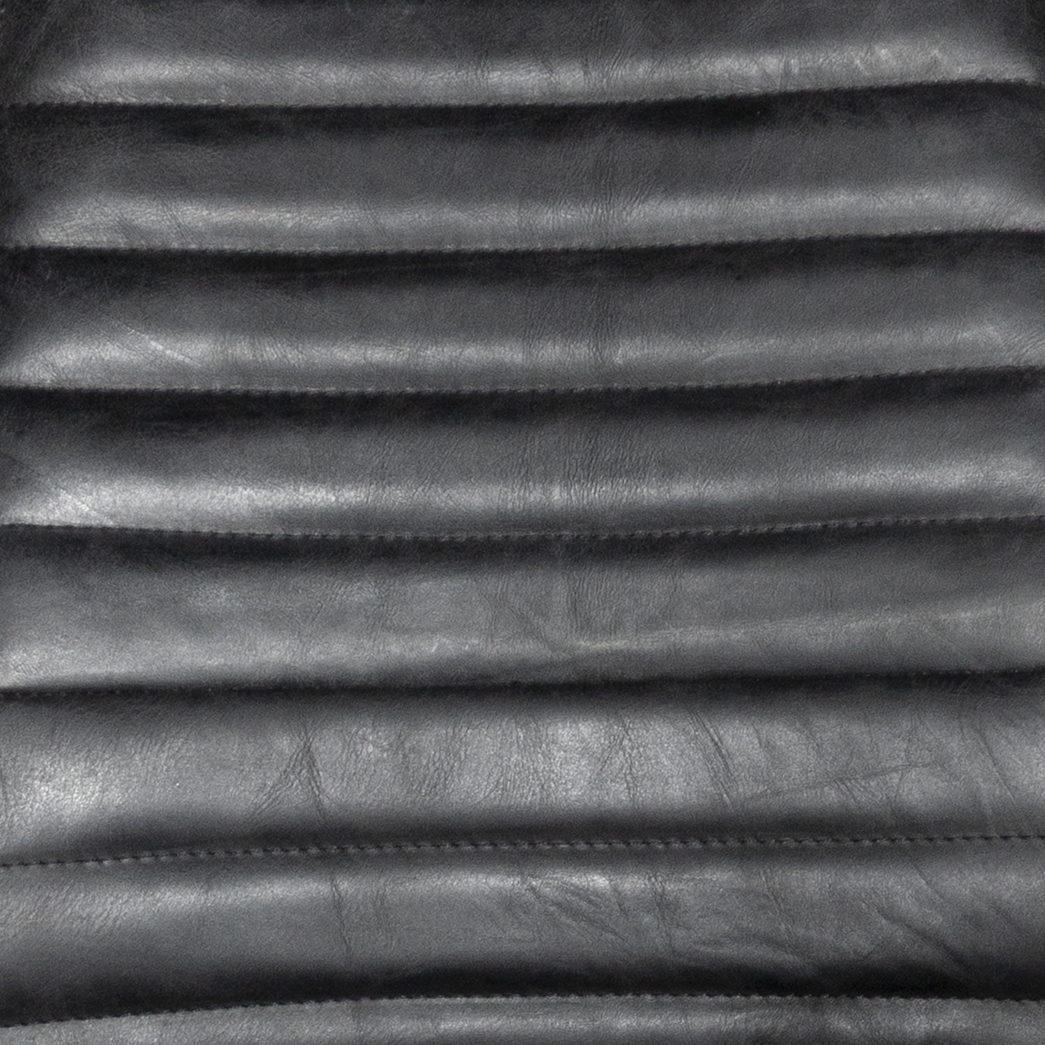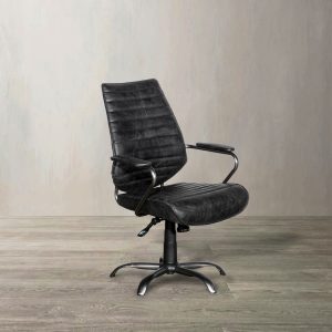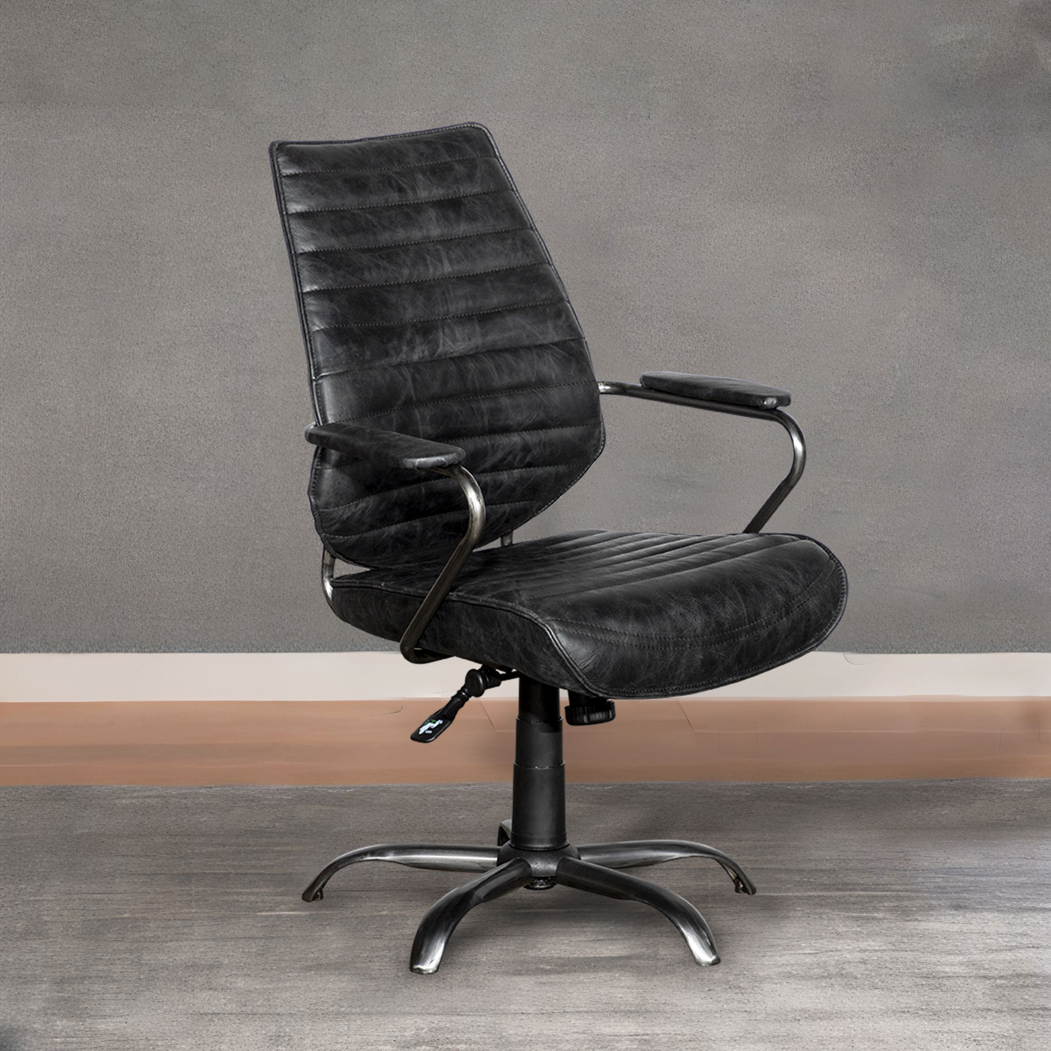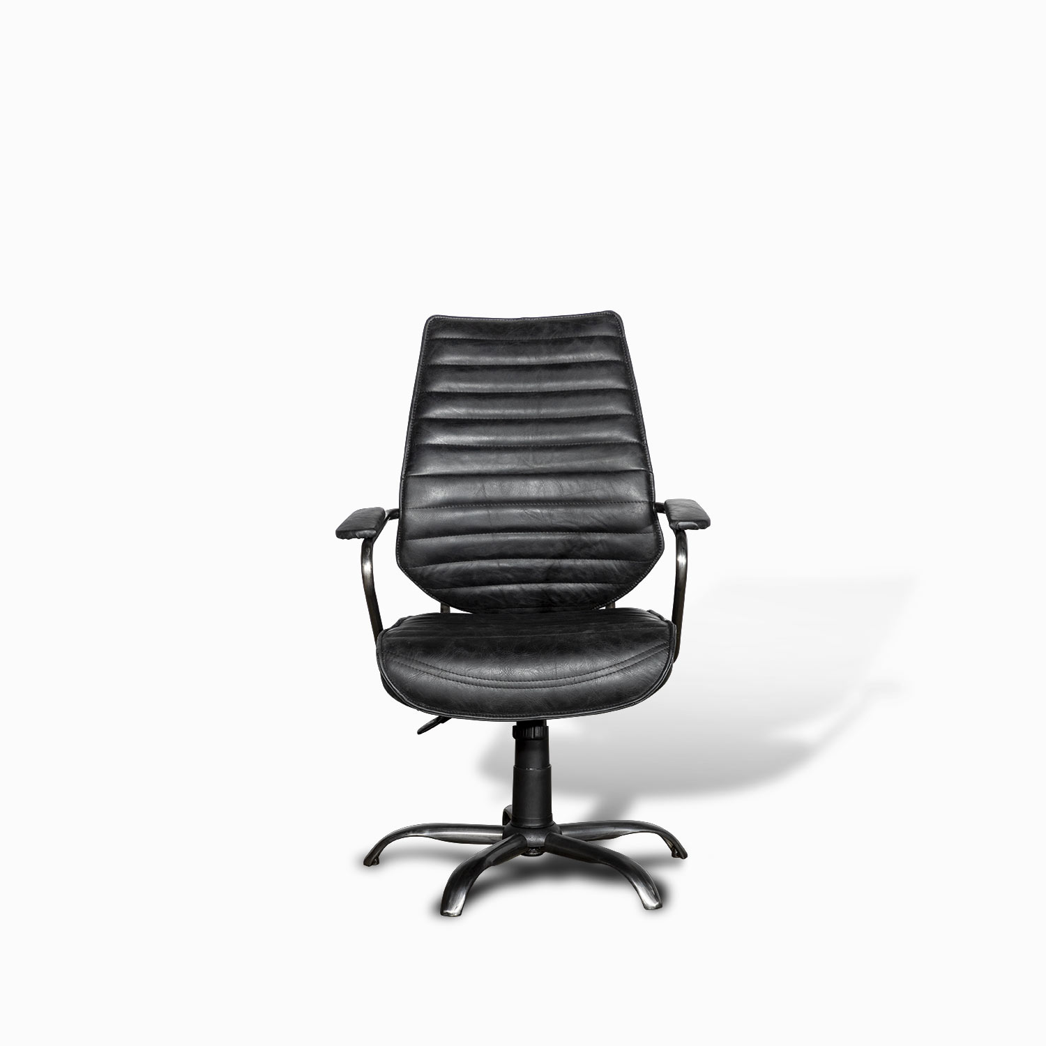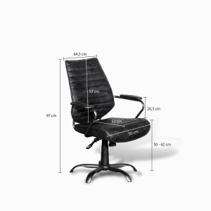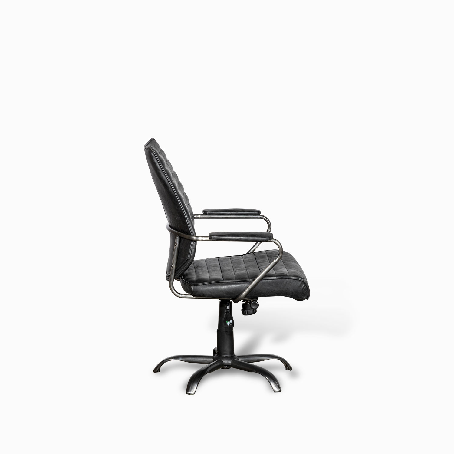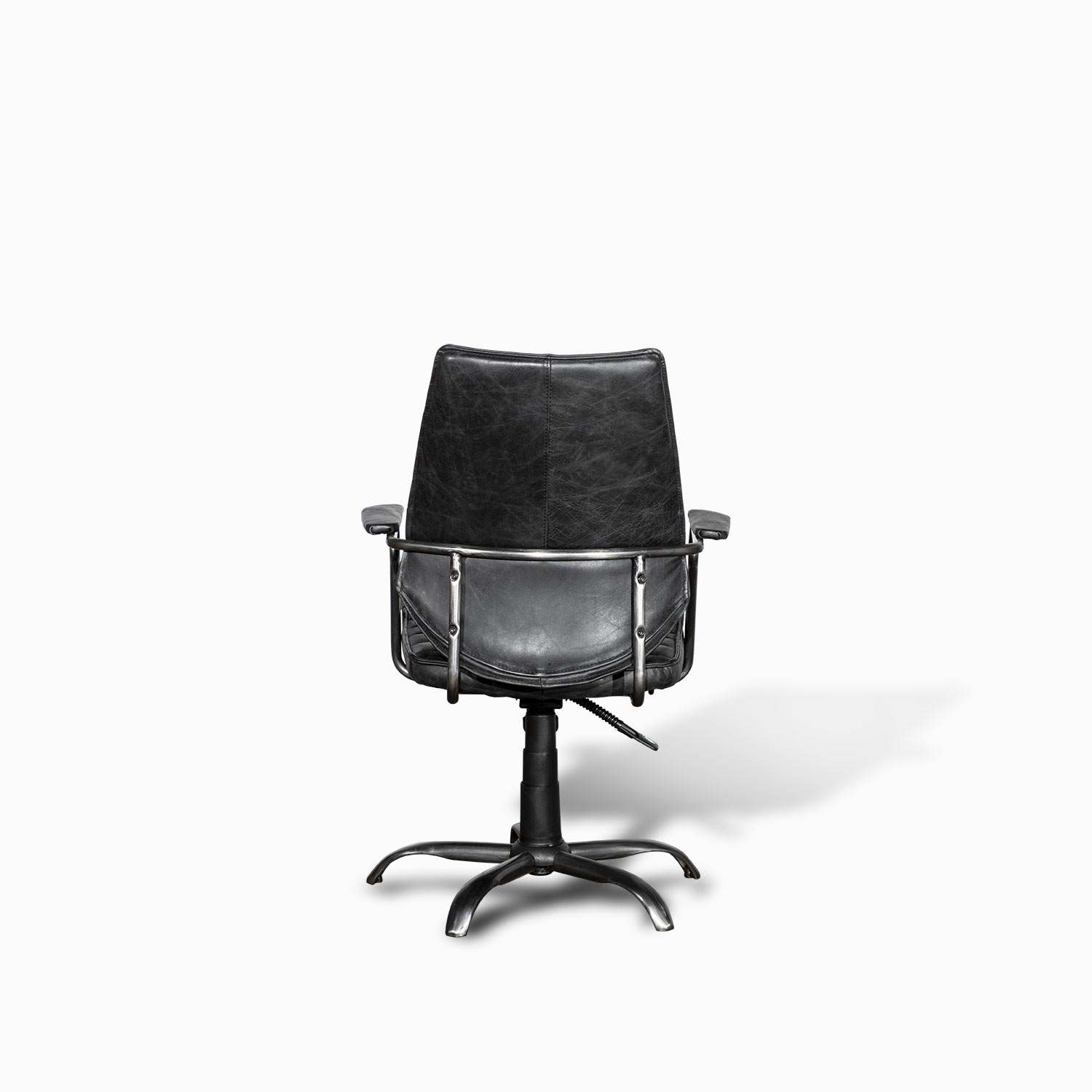 Silla giratoria para escritorio con tapizado en cuero color negro y patas y estructura en hierro, complementa tu oficina o estudio con una pieza industrial con gran trabajo artesanal. 100% cuero importado. Cada pieza es original y única, porque es procesada a mano. El efecto desgastado del cuero se logra mediante un proceso que realza los poros, las cicatrices y sus arrugas auténticas, creando variaciones de color y textura entre una pieza y otra, convirtiéndola en una obra de arte irrepetible. Con el tiempo el desgaste se hace más hermoso.