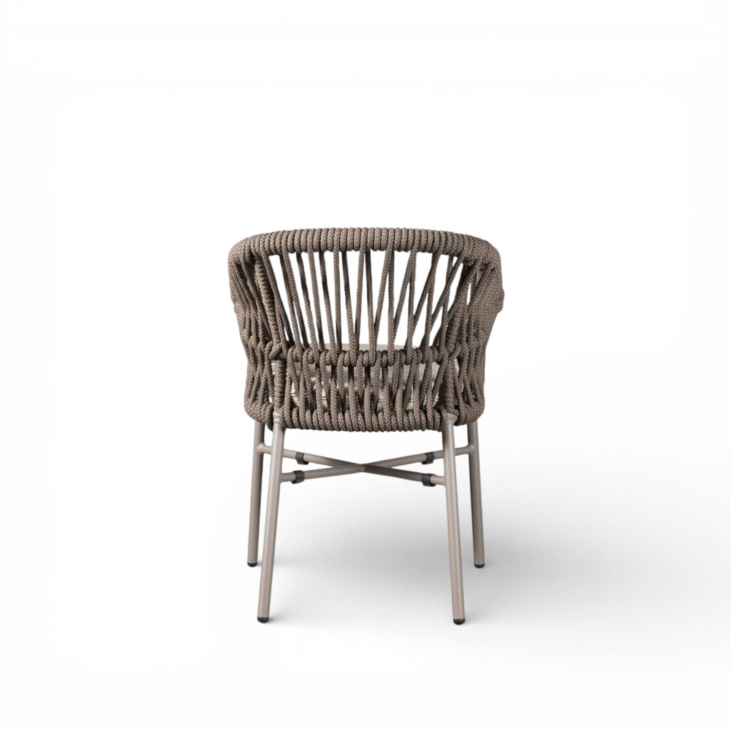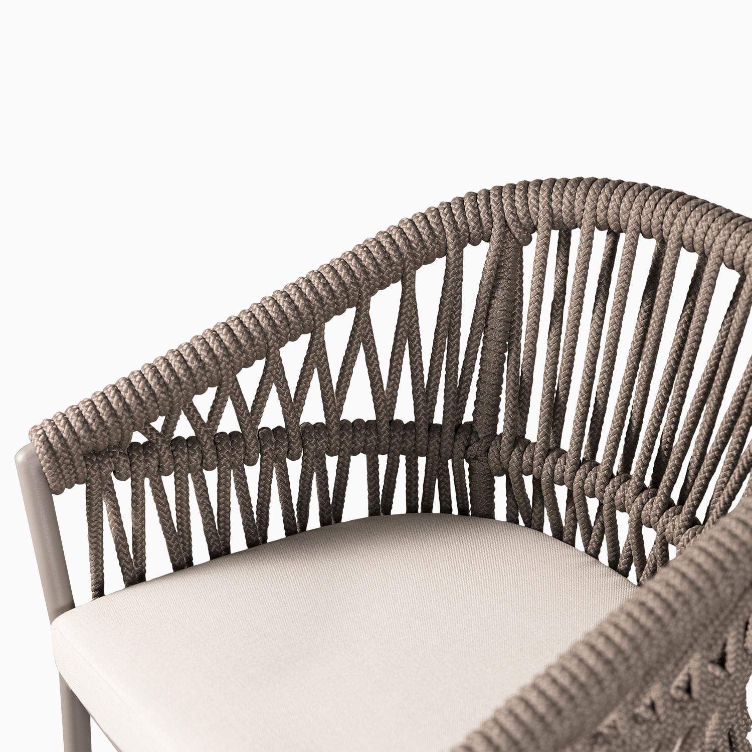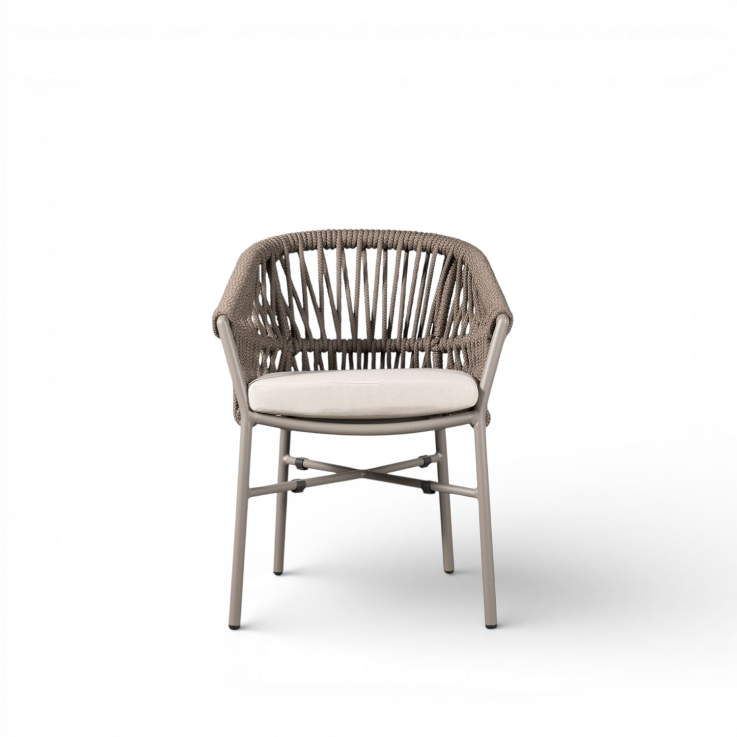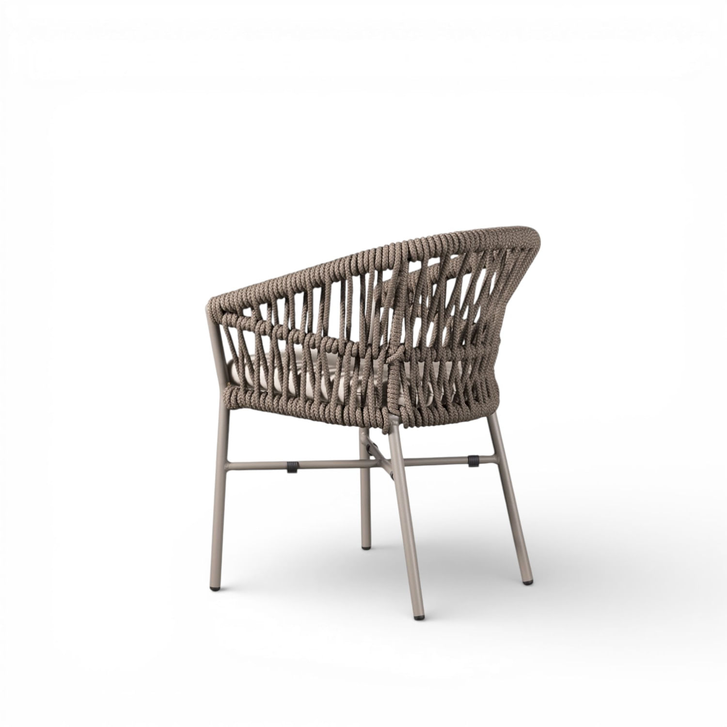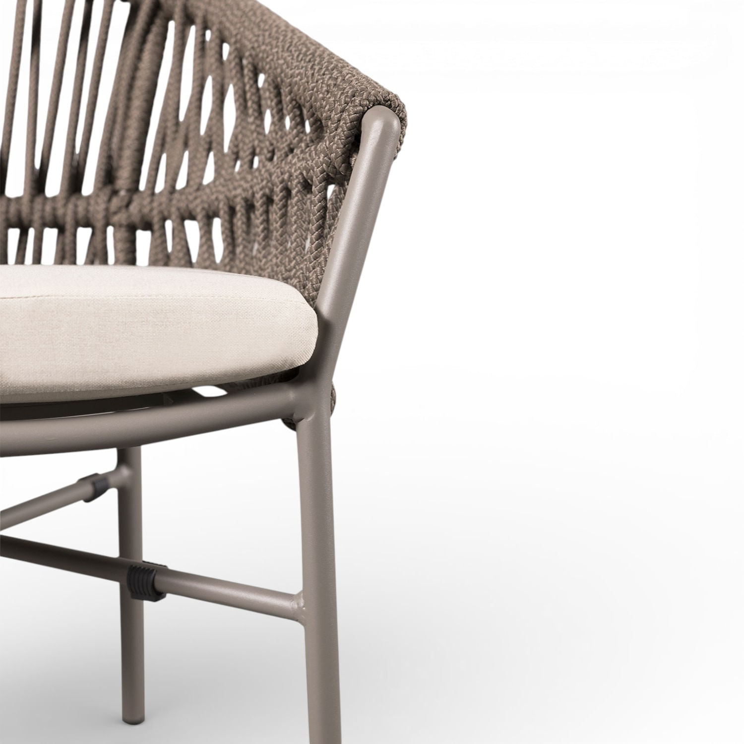 Destaca por su respaldo envolvente con un intrincado tejido de cuerdas que aporta una estética artesanal y moderna. Incluye un cojín de asiento acolchado con espuma de poliuretano, diseñado para ofrecer una experiencia de descanso prolongada y placentera durante tus comidas al aire libre. Construida con una estructura de aluminio y acabados en olefina, materiales seleccionados por su excelente comportamiento frente a la humedad y los rayos UV. A pesar de su ligereza, esta silla cuenta con una capacidad de carga de hasta 160 kg, garantizando seguridad y firmeza para todos tus invitados.