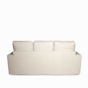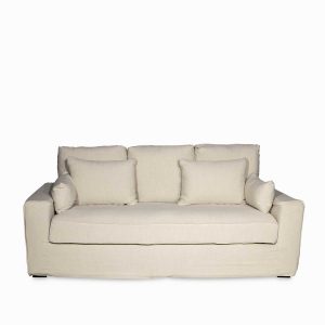 Sofá dos puestos, tapizado en lino de color crudo, es un mueble confortable cuyas proporciones lo hacen de estilo modernista de líneas limpias, su estilo complementarlo diferentes estilos decorativos.