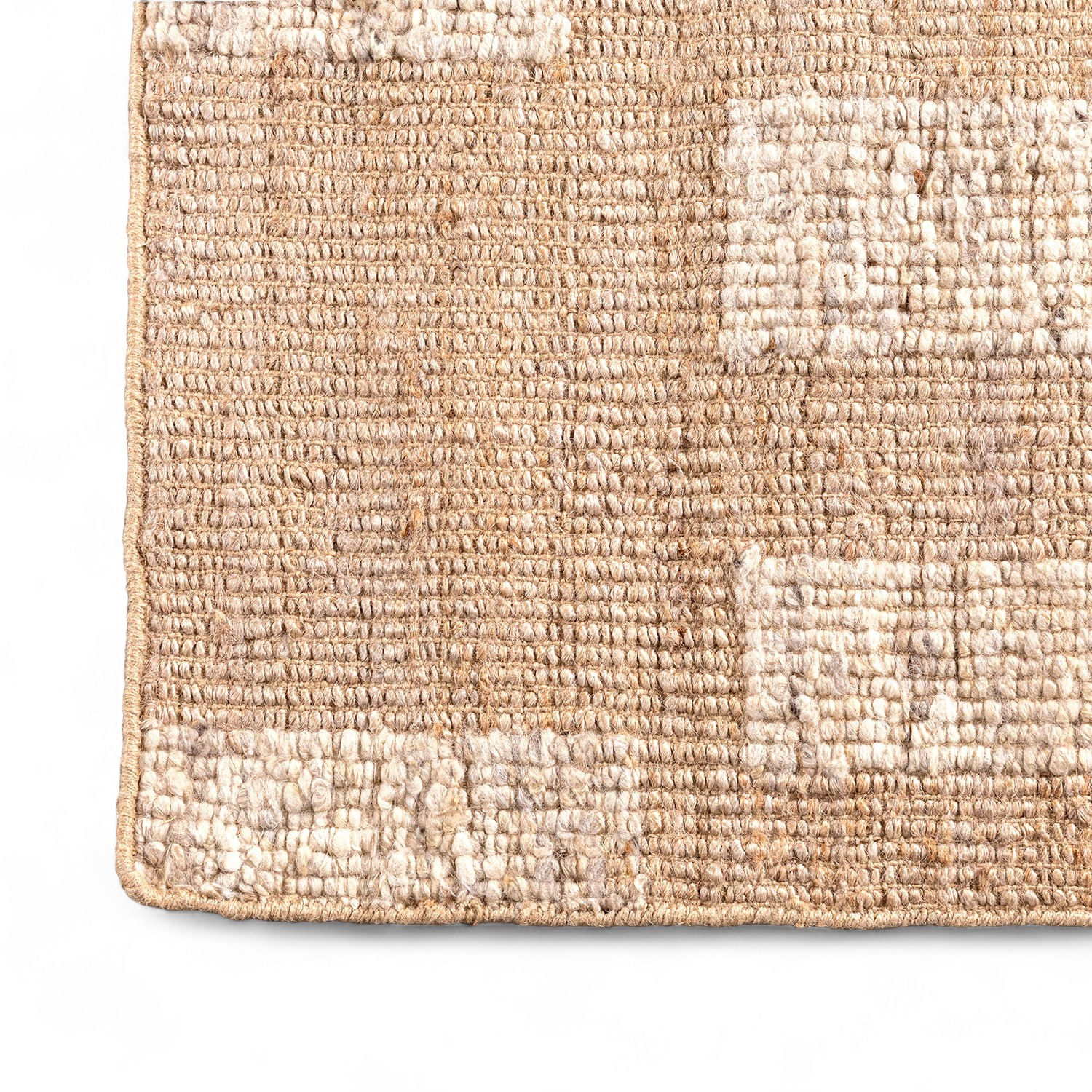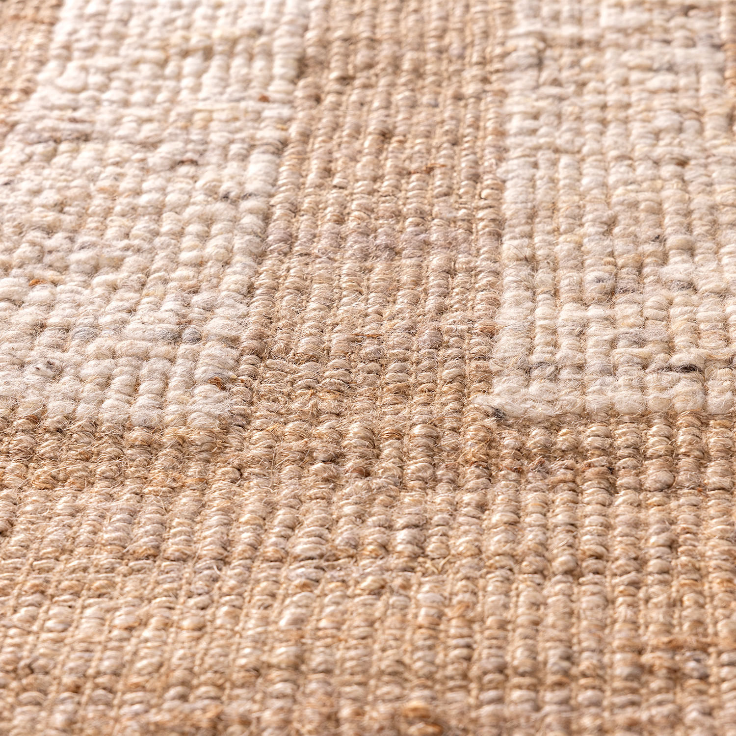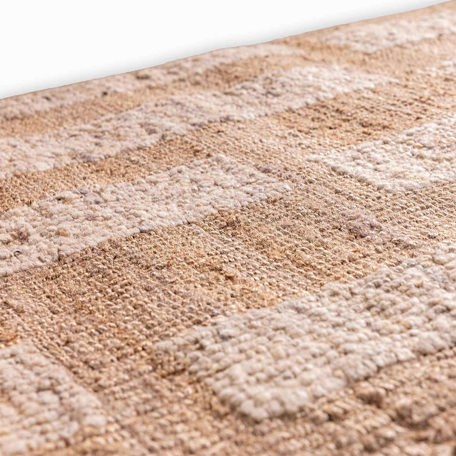 Tapete en yute y lana de diseño artesanal, de la colección Crenwa (140 cm x 200 cm). Una pieza decorativa ideal para aportar personalidad y complementar espacios, aporta calidez y elegancia a cualquier espacio, delimitando los entornos según la disposición en que se utilice.
