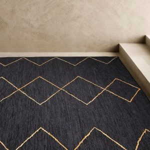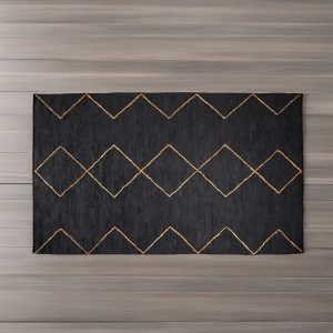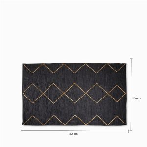 Tapete decorativo en cuero, algodón y yute. Una pieza decorativa ideal para aportar personalidad y complementar espacios con encanto en color natural y negro. Con diseños geométricos de estilo étnico en rombos que aportan calidez, modernismo y encanto a cualquier espacio, delimitando los entornos según la disposición en que se utilice. Ideal para salas de estar, alcobas y bibliotecas.