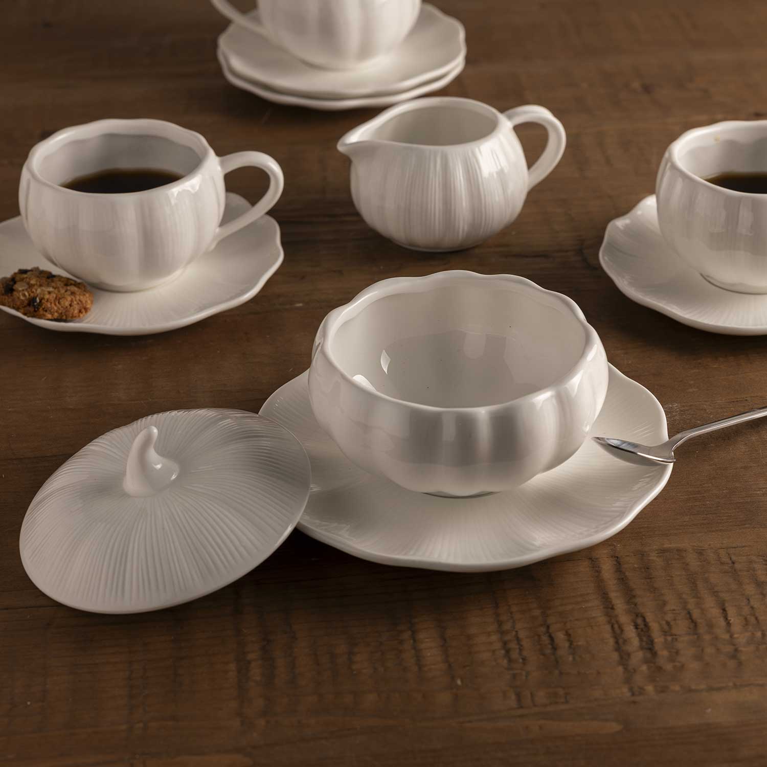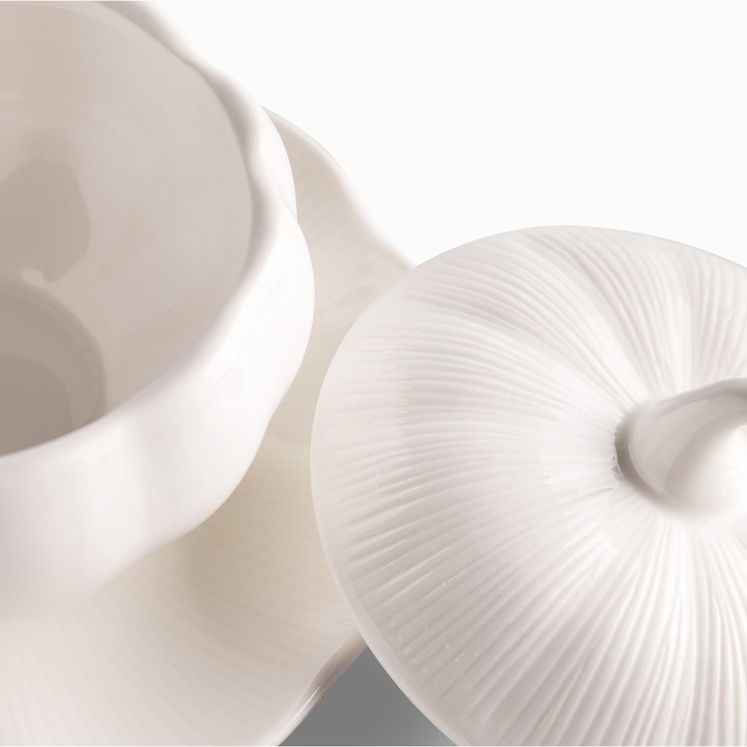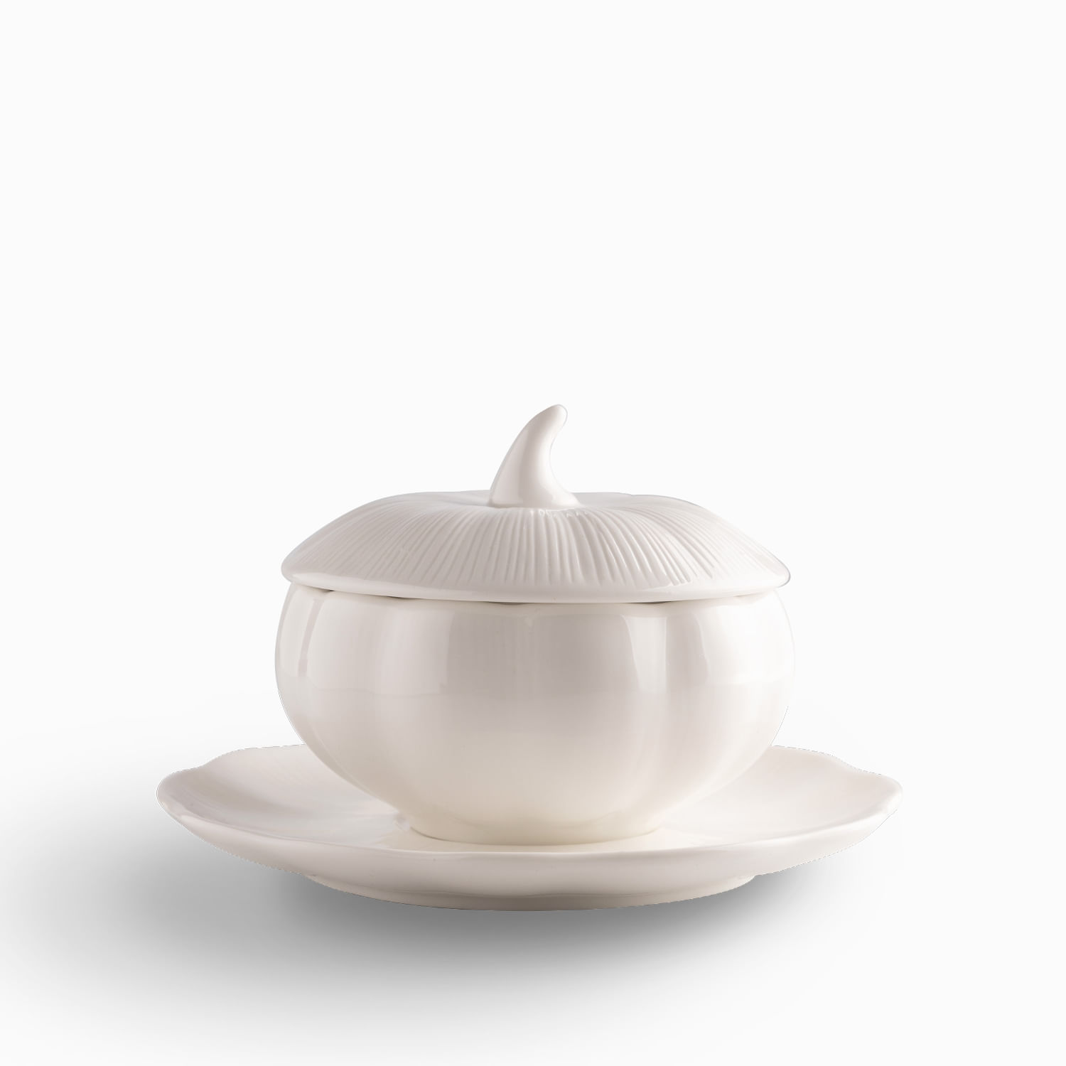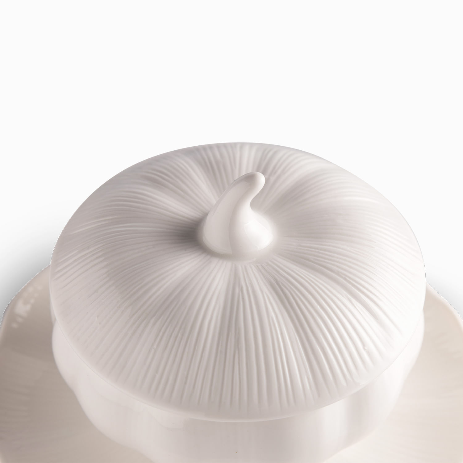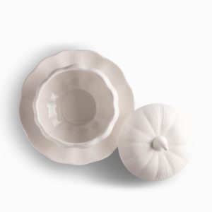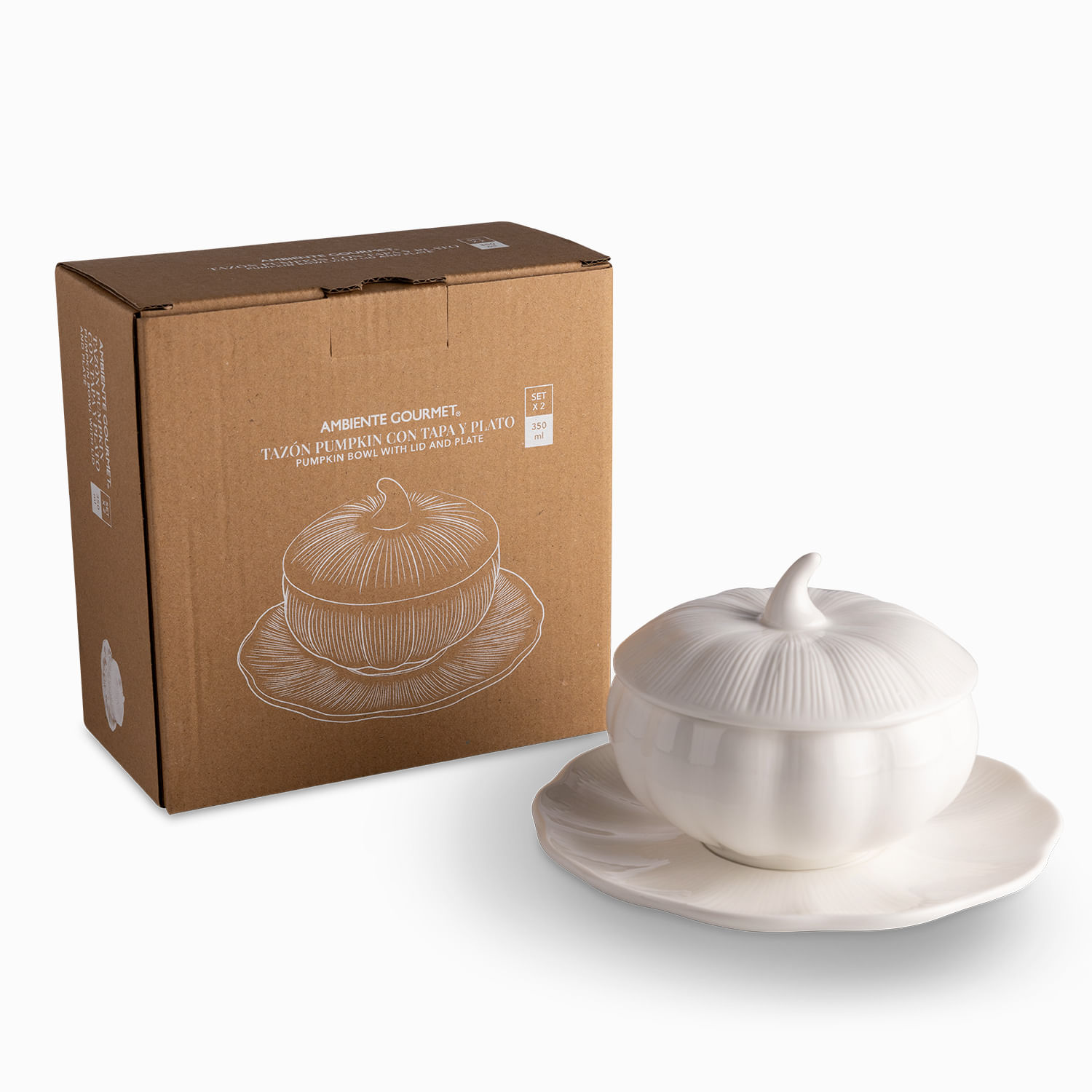 Este ingenioso trío de servicio no es solo vajilla; es una solución de presentación. El tazón con tapa y plato Pumpkin combina la calidad superior de la porcelana con un diseño temático sutil en color blanco, creando una pieza altamente funcional para servir o conservar porciones individuales. Diseñado para el anfitrión que valora la funcionalidad. El tazón de 350 ml de capacidad (12 cm de diámetro) es ideal para porciones individuales de sopa, mousse, guarniciones o incluso para guardar azúcar.