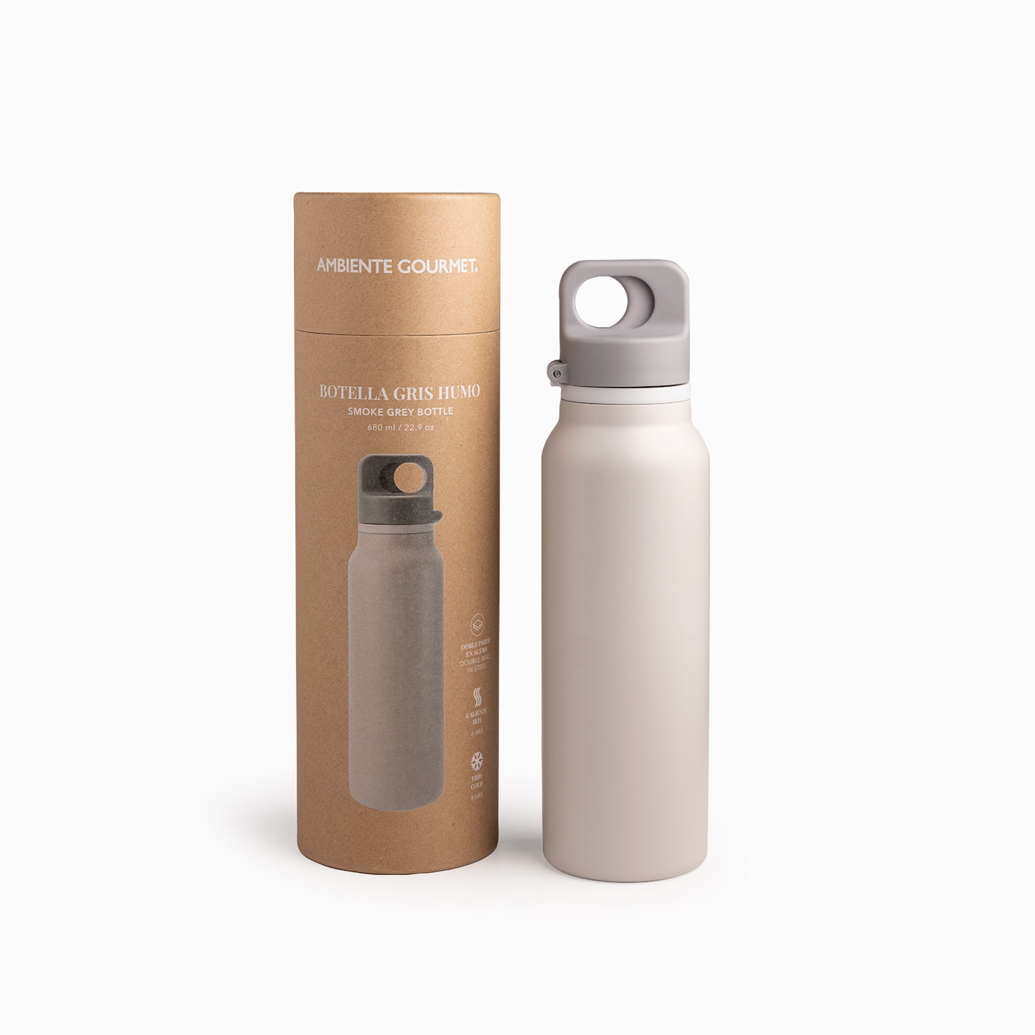 Para el gimnasio, senderismo, o simplemente para cumplir tus metas de consumo de agua diario en casa. El termo de doble pared es la elección del consumidor activo que busca durabilidad, gran capacidad (680ml) y una pieza de diseño funcional (color gris humo).