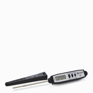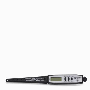 Termómetro digital de cocina en acero inoxidable. Es importante a la hora de cocinar ciertos alimentos verificar la temperatura interna para garantizar que estén bien cocidos. El termómetro digital es rápido y preciso en esta medición, pues tarda de 2 a 5 segundos en dar la temperatura de la preparación.