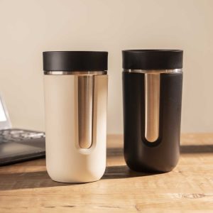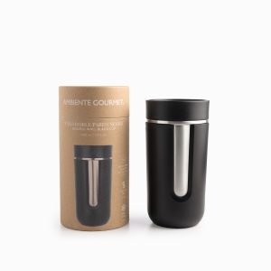 Este vaso de doble pared es una solución de hidratación con un diseño minimalista en color negro con una avanzada tecnología térmica de vacío en acero inoxidable, ideal para mantener la temperatura de 400 ml de bebida por tiempo prolongado. Su estructura robusta integra materiales como polipropileno y silicona con un sistema de resorte que asegura un cierre hermético